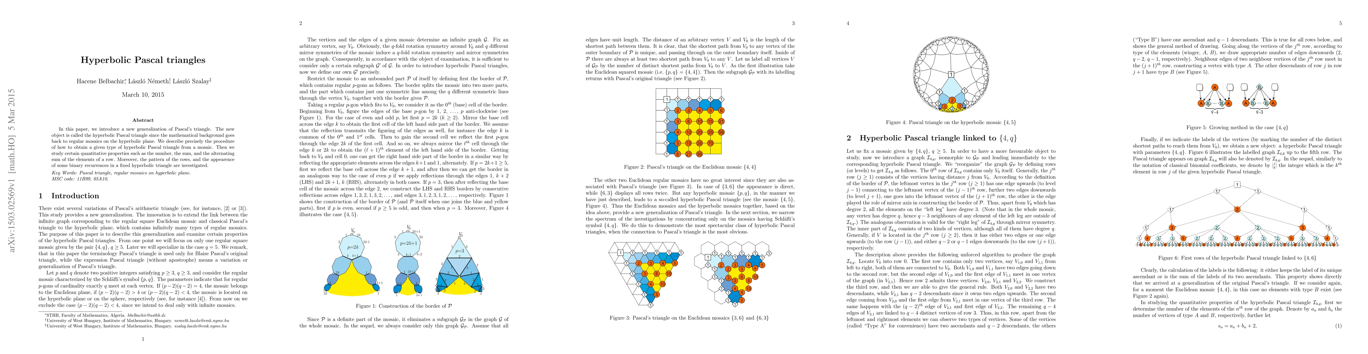 The paper presents a novel generalization of Pascal's triangle called the hyperbolic Pascal triangle, derived from hyperbolic plane mosaics, and investigates its quantitative properties, patterns, and binary recurrences. The study focuses on the generation process, number, sum, and alternating sum of elements in each row.