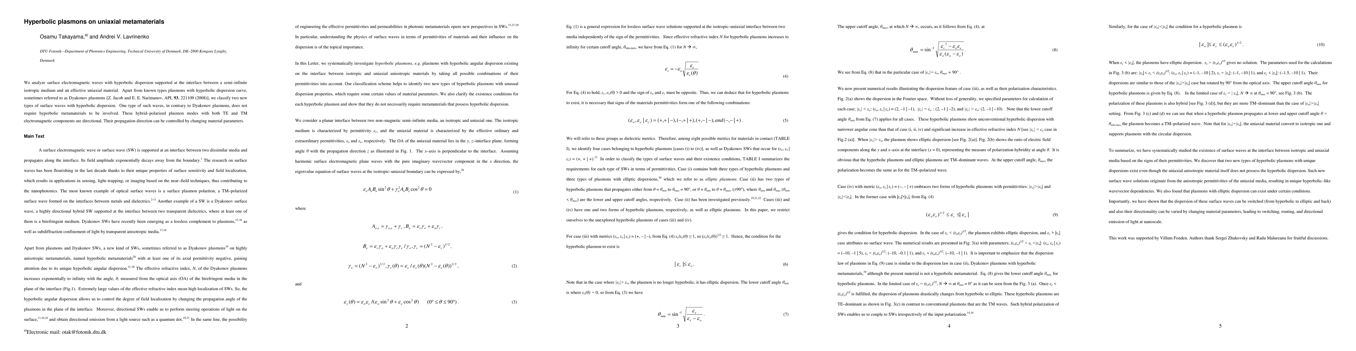 We analyze surface electromagnetic waves with hyperbolic dispersion supported at the interface between a semi-infinite isotropic medium and an effective uniaxial material. Apart from known types plasmons with hyperbolic dispersion curve, sometimes referred to as Dyakonov plasmons [Z. Jacob and E. E. Narimanov, APL 93, 221109 (2008)], we classify two new types of surface waves with hyperbolic dispersion. One type of such waves, in contrary to Dyakonov plasmons, does not require hyperbolic metamaterials to be involved. These hybrid-polarized plasmon modes with both TE and TM electromagnetic components are directional. Their propagation direction can be controlled by changing material parameters.