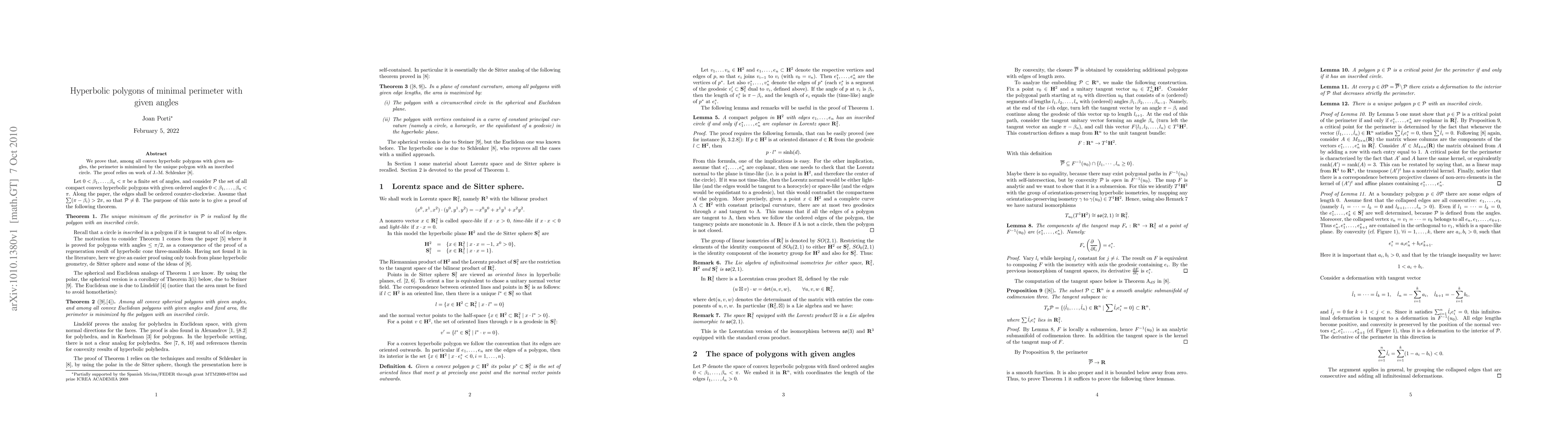 This paper proves that the convex hyperbolic polygon with minimal perimeter for given angles is uniquely determined by having an inscribed circle. The proof builds on the foundational work of J.-M. Schlenker.