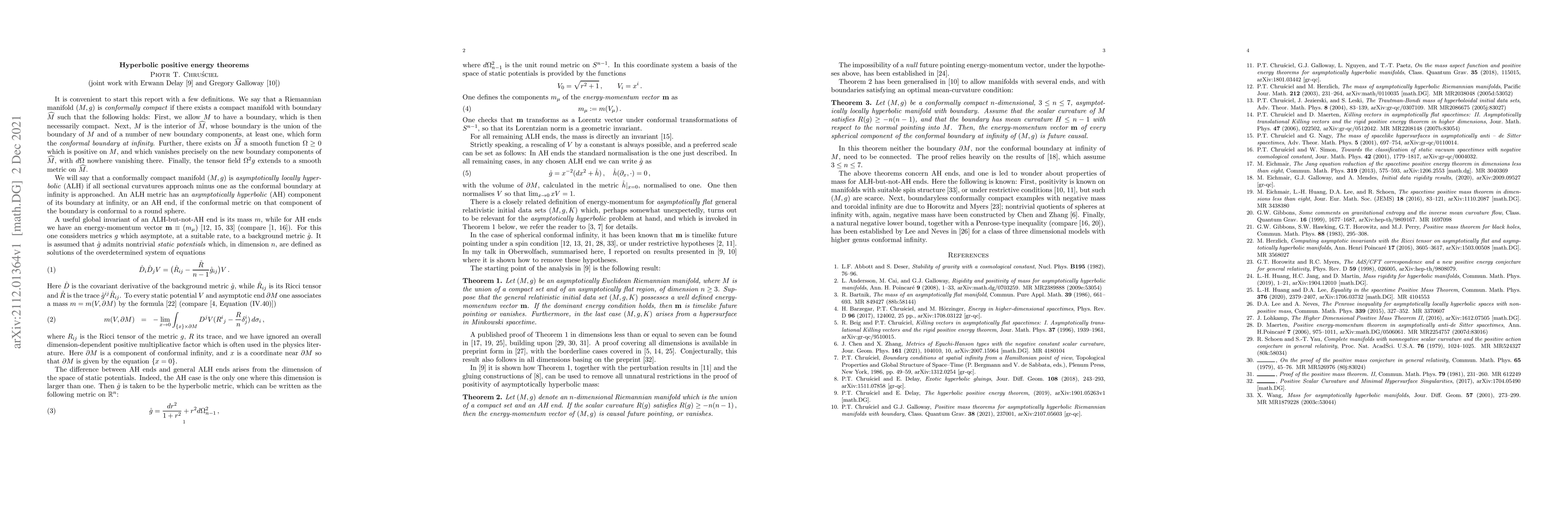 This paper is a comprehensive review summarizing positive energy theorems applicable to asymptotically hyperbolic manifolds, outlining their mathematical foundations, proofs, and implications in general relativity, emphasizing their significance in understanding gravitational systems' stability and evolution.