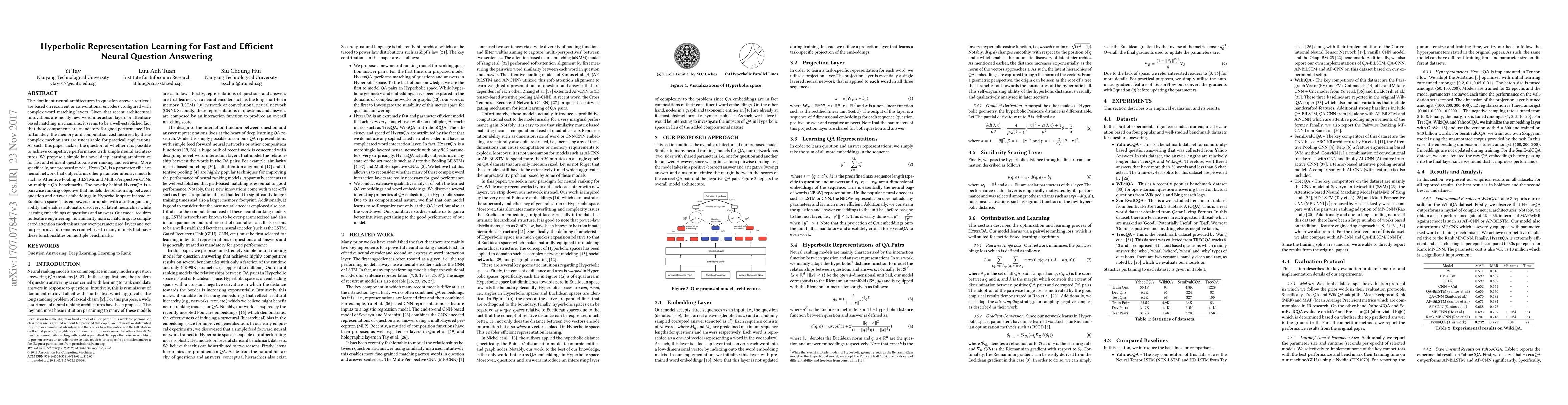 A new neural architecture called HyperQA outperforms complex models in question answering while requiring less memory and computation, using a novel pairwise ranking objective that models relationships between question and answer embeddings in hyperbolic space.