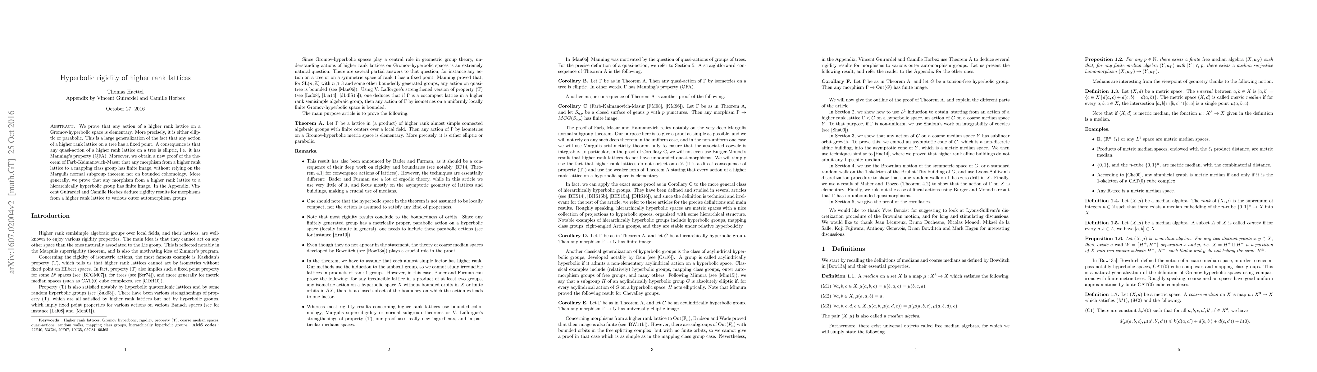 The paper demonstrates that actions of higher rank lattices on Gromov-hyperbolic spaces are elementary, either elliptic or parabolic, extending results for tree actions. It also proves that any quasi-action on a tree has Manning's property and provides a new proof for a theorem on morphisms from higher rank lattices to mapping class groups.