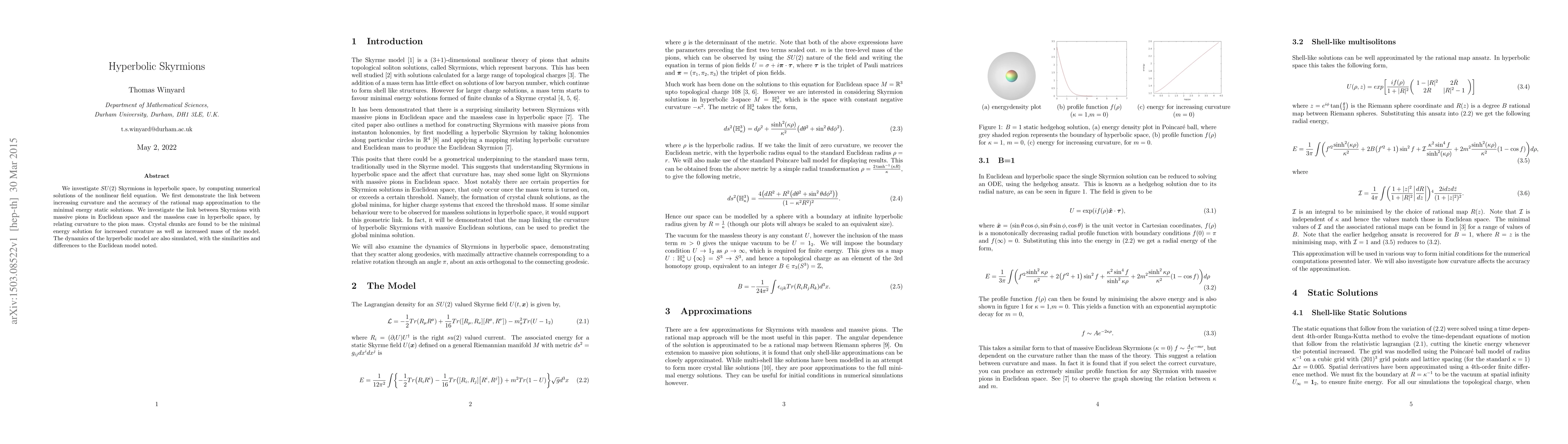 We investigate SU(2) Skyrmions in hyperbolic space, by computing numerical solutions of the nonlinear field equation. We first demonstrate the link between increasing curvature and the accuracy of the rational map approximation to the minimal energy static solutions. We investigate the link between Skyrmions with massive pions in Euclidean space and the massless case in hyperbolic space, by relating curvature to the pion mass. Crystal chunks are found to be the minimal energy solution for increased curvature as well as increased mass of the model. The dynamics of the hyperbolic model are also simulated, with the similarities and differences to the Euclidean model noted.