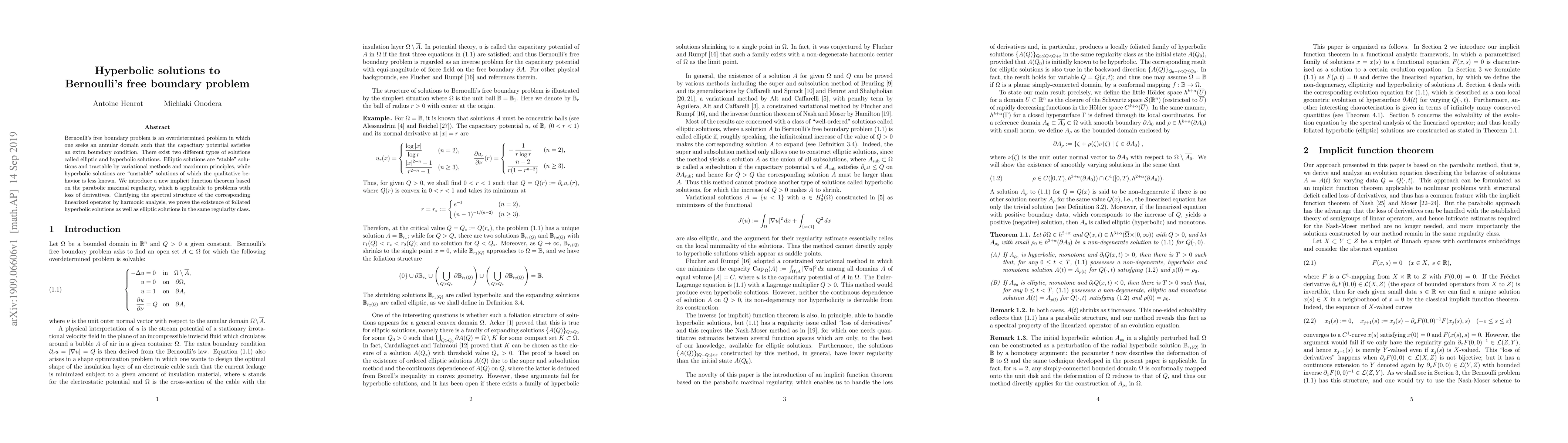 Bernoulli's free boundary problem is an overdetermined problem in which one seeks an annular domain such that the capacitary potential satisfies an extra boundary condition. There exist two different types of solutions called elliptic and hyperbolic solutions. Elliptic solutions are ``stable'' solutions and tractable by variational methods and maximum principles, while hyperbolic solutions are ``unstable'' solutions of which the qualitative behavior is less known. We introduce a new implicit function theorem based on the parabolic maximal regularity, which is applicable to problems with loss of derivatives. Clarifying the spectral structure of the corresponding linearized operator by harmonic analysis, we prove the existence of foliated hyperbolic solutions as well as elliptic solutions in the same regularity class.