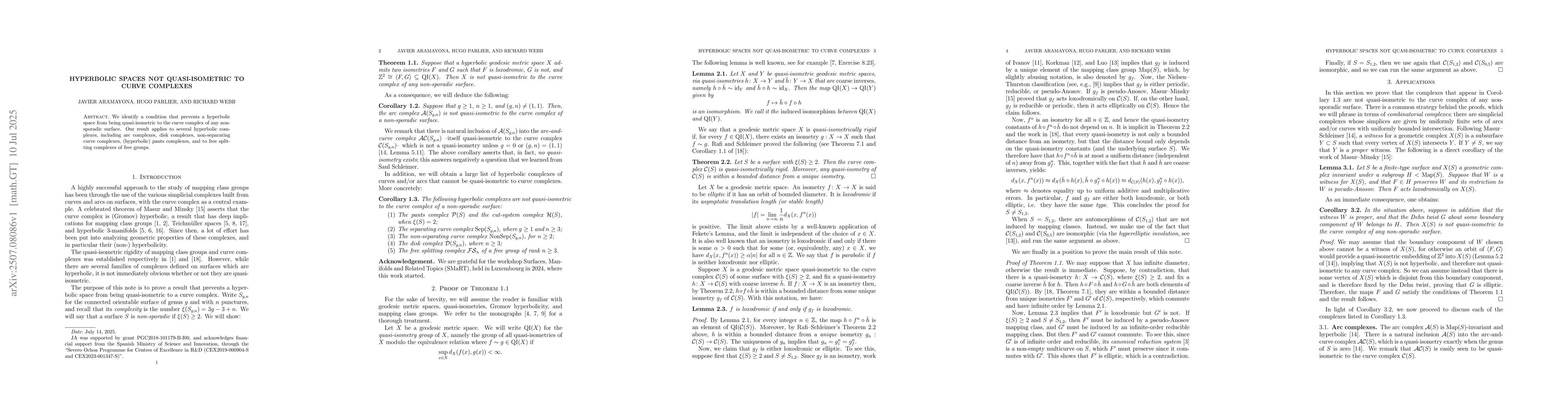 We identify a condition that prevents a hyperbolic space from being quasi-isometric to the curve complex of any non-sporadic surface. Our result applies to several hyperbolic complexes, including arc complexes, disk complexes, non-separating curve complexes, (hyperbolic) pants complexes, and to free splitting complexes of free groups.