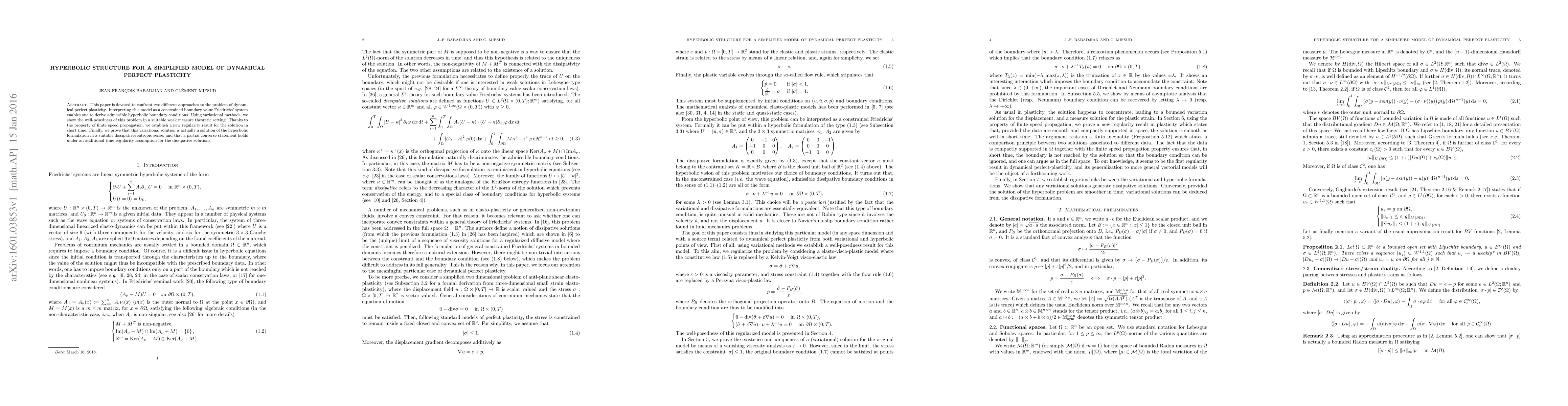This paper develops a hyperbolic structure for a simplified model of dynamical perfect plasticity, deriving admissible hyperbolic boundary conditions and proving well-posedness in a weak measure theoretic setting. It establishes a new regularity result and demonstrates the equivalence between variational and hyperbolic formulations under certain conditions.