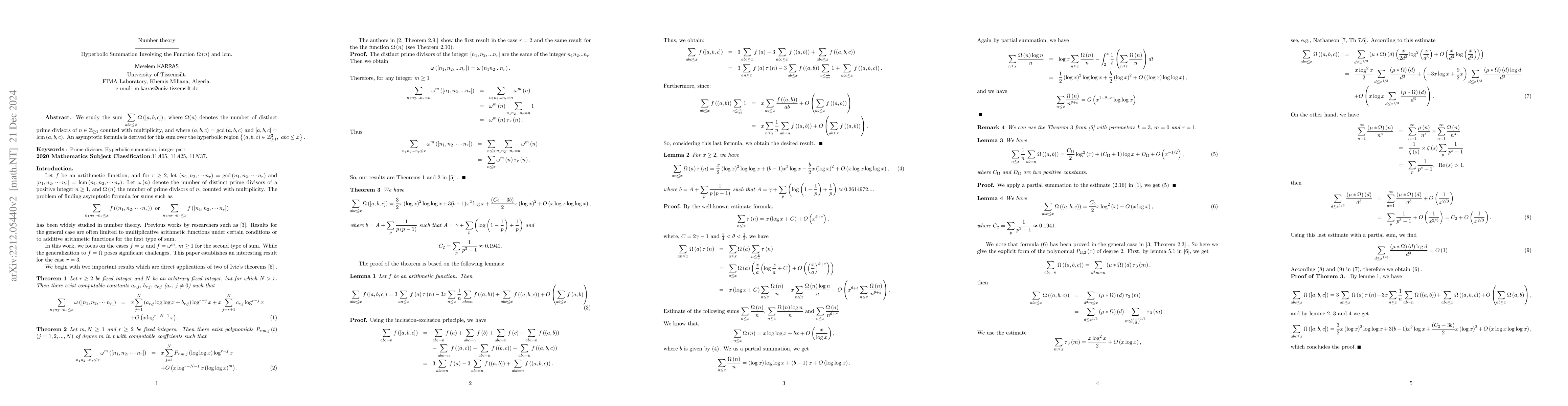 This paper investigates the asymptotic behavior of sums involving the function $\Omega(n)$, which counts the prime power divisors of $n$, over the hyperbolic region defined by $abc \leq x$. It provides asymptotic formulas for sums where $\Omega$ is applied to the GCD and LCM of triples $(a, b, c)$.