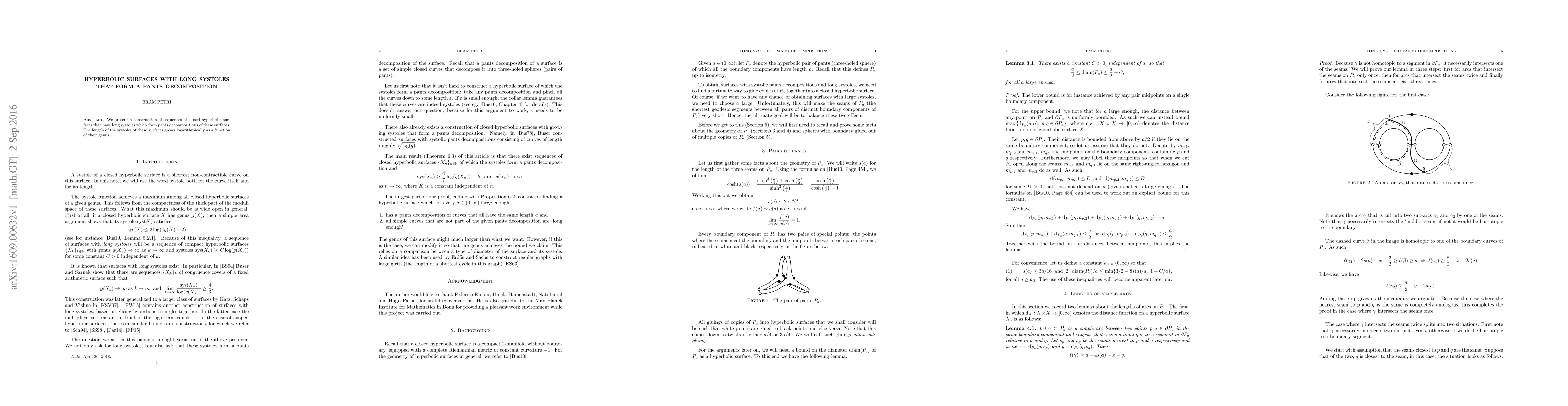 This paper constructs sequences of closed hyperbolic surfaces with long systoles that decompose into pants, where the systole length grows logarithmically with the genus of the surface.