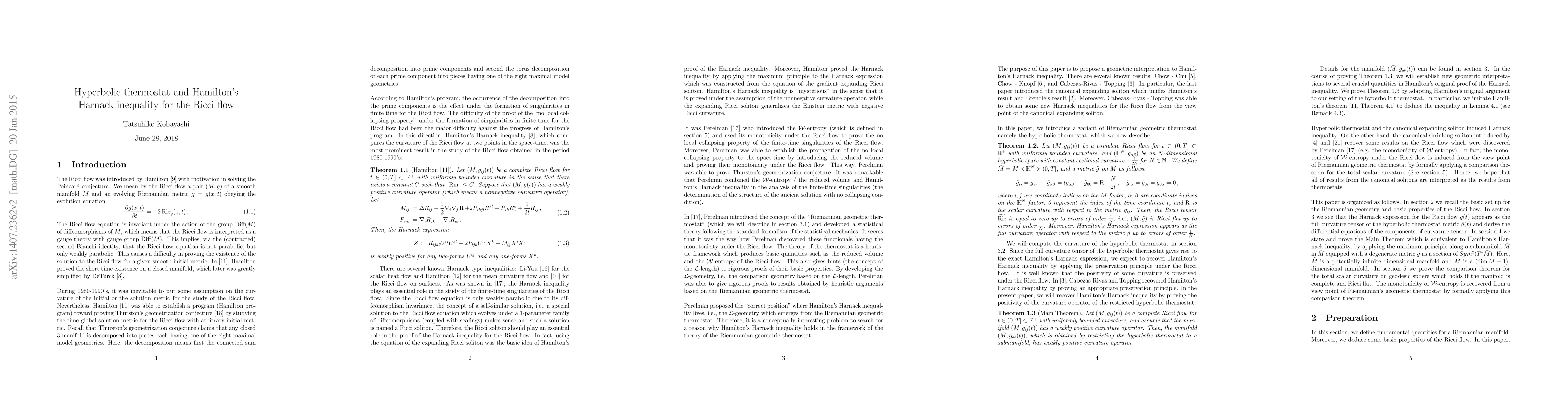 Summary: This paper establishes Hamilton's Harnack inequality for the Ricci flow by leveraging the concept of a hyperbolic thermostat, providing a new perspective on the mathematical properties of the Ricci flow.