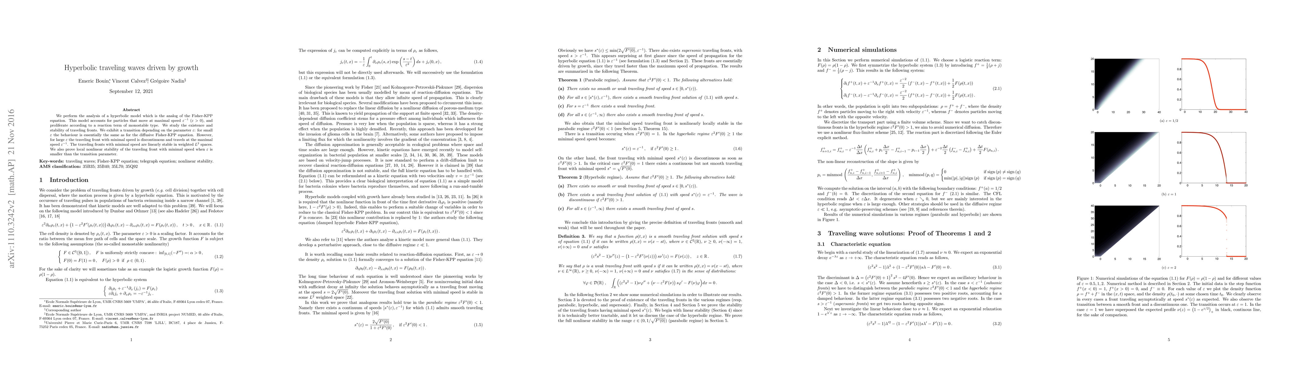 We perform the analysis of a hyperbolic model which is the analog of the Fisher-KPP equation. This model accounts for particles that move at maximal speed $\epsilon^{-1}$ ($\epsilon\textgreater{}0$), and proliferate according to a reaction term of monostable type. We study the existence and stability of traveling fronts. We exhibit a transition depending on the parameter $\epsilon$: for small $\epsilon$ the behaviour is essentially the same as for the diffusive Fisher-KPP equation. However, for large $\epsilon$ the traveling front with minimal speed is discontinuous and travels at the maximal speed $\epsilon^{-1}$. The traveling fronts with minimal speed are linearly stable in weighted $L^2$ spaces. We also prove local nonlinear stability of the traveling front with minimal speed when $\epsilon$ is smaller than the transition parameter.