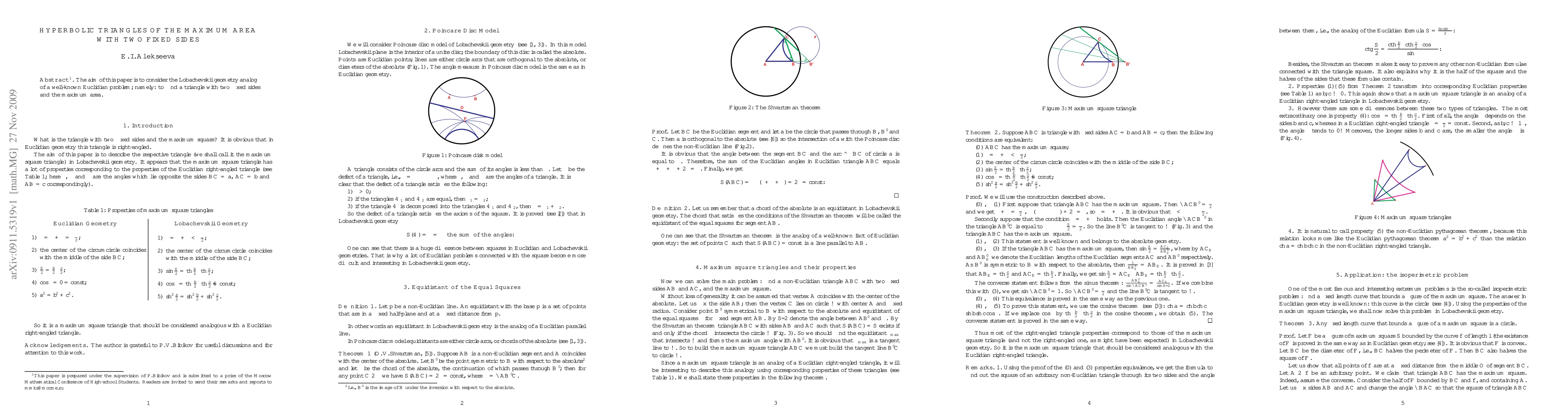 The aim of this paper is to consider the Lobachevskii geometry analog of a well-known Euclidian problem; namely: to find a triangle with two fixed sides and the maximum area