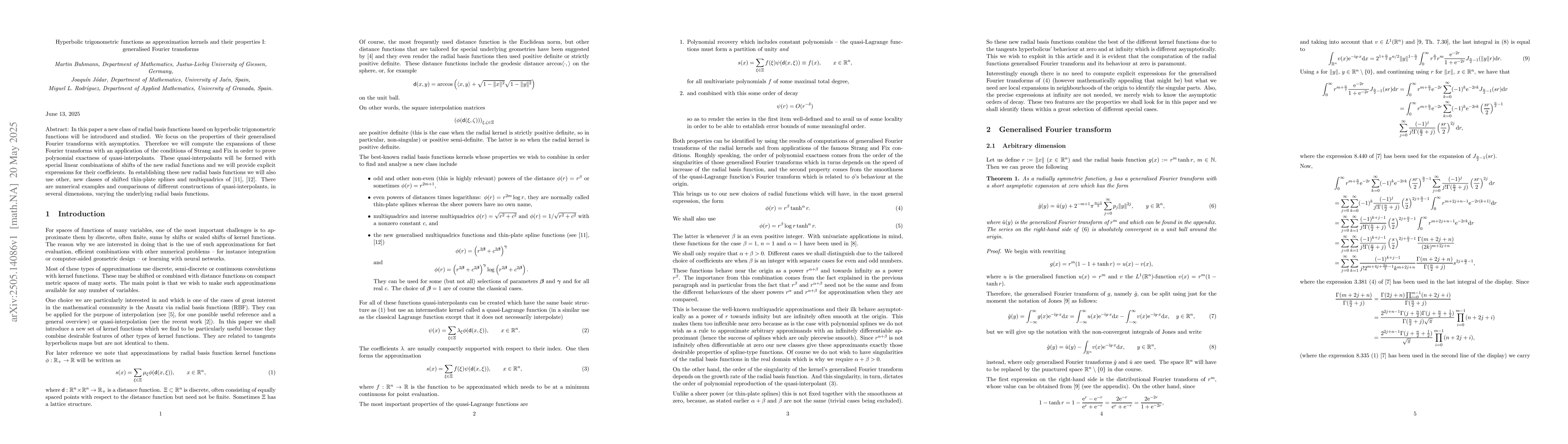 The research introduces a new class of radial basis functions derived from hyperbolic trigonometric functions, analyzing their generalized Fourier transforms with asymptotic conditions. It proves polynomial exactness of quasi-interpolants formed by special linear combinations of shifts of these new radial functions, providing explicit expressions for their coefficients.