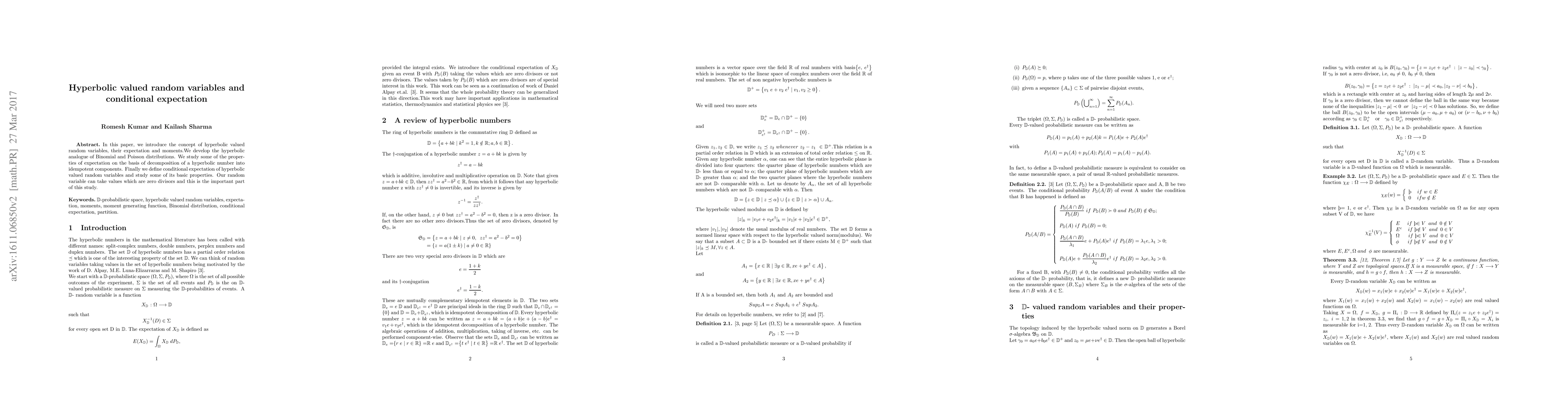 This paper introduces hyperbolic valued random variables, exploring their expectation, moments, and the hyperbolic analogues of Binomial and Poisson distributions. It also defines conditional expectation for these variables, emphasizing properties based on the decomposition of hyperbolic numbers into idempotent components.