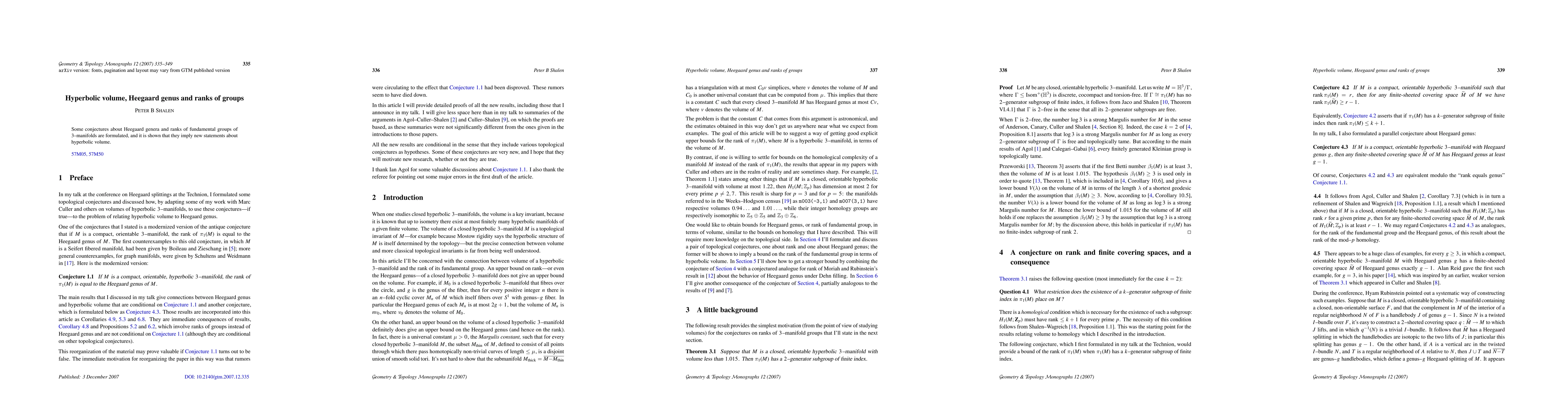 This paper presents conjectures on Heegaard genera and ranks of fundamental groups of 3-manifolds, demonstrating that these imply novel insights into hyperbolic volume.