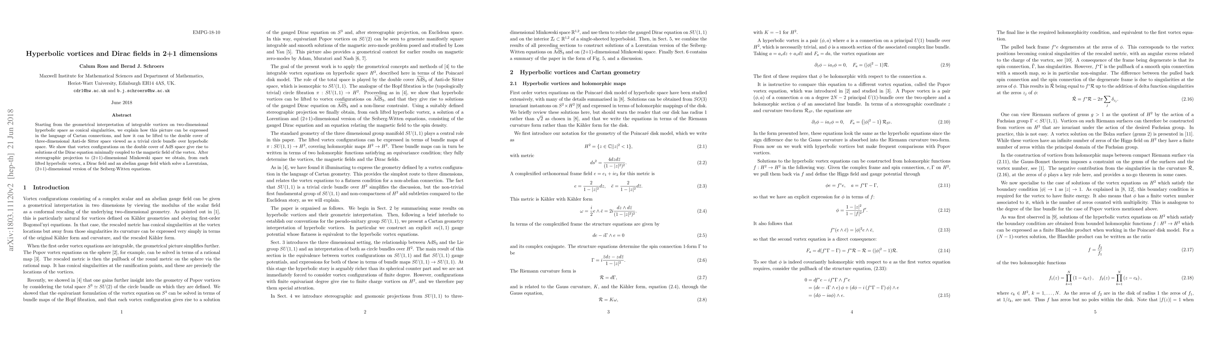 Starting from the geometrical interpretation of integrable vortices on two-dimensional hyperbolic space as conical singularities, we explain how this picture can be expressed in the language of Cartan connections, and how it can be lifted to the double cover of three-dimensional Anti-de Sitter space viewed as a trivial circle bundle over hyperbolic space. We show that vortex configurations on the double cover of AdS space give rise to solutions of the Dirac equation minimally coupled to the magnetic field of the vortex. After stereographic projection to (2+1)-dimensional Minkowski space we obtain, from each lifted hyperbolic vortex, a Dirac field and an abelian gauge field which solve a Lorentzian, (2+1)-dimensional version of the Seiberg-Witten equations.