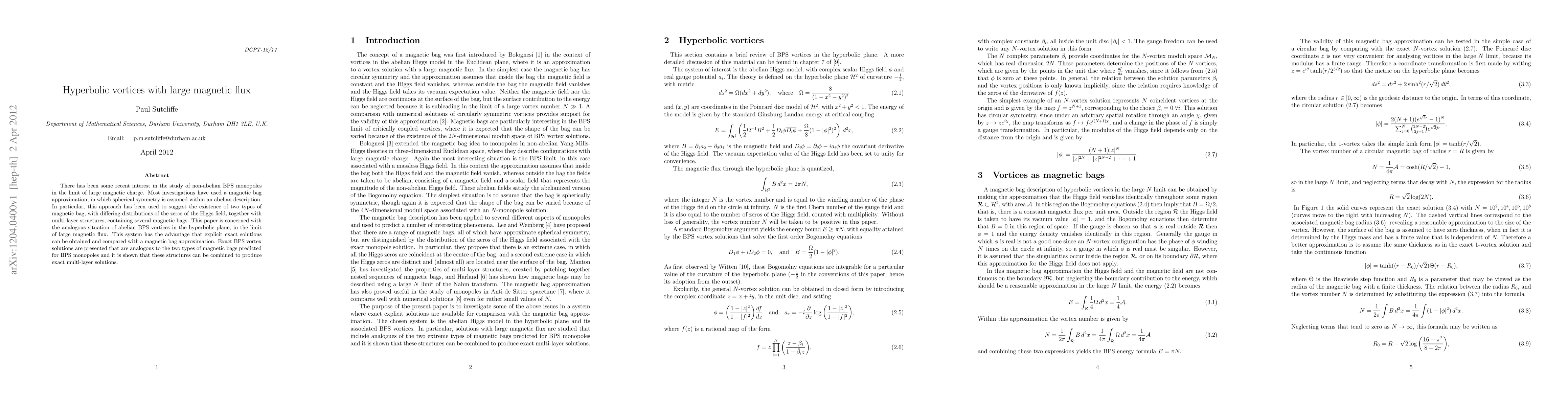 This paper investigates abelian BPS vortices in the hyperbolic plane with large magnetic flux, presenting exact solutions analogous to magnetic bag structures. It demonstrates how these solutions can be combined to form multi-layer configurations, offering a comparison to magnetic bag approximations.