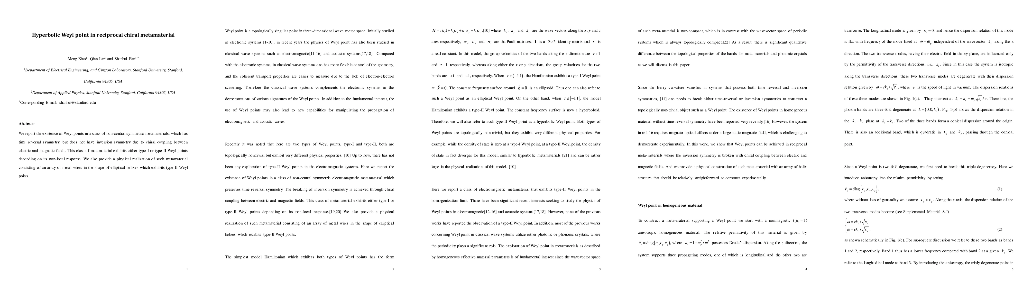 Summary: This paper identifies Weyl points in chiral reciprocal metamaterials lacking inversion symmetry, presenting either type-I or type-II points based on their non-local response, and demonstrates a physical model using an array of elliptical helix metal wires showcasing type-II Weyl points.