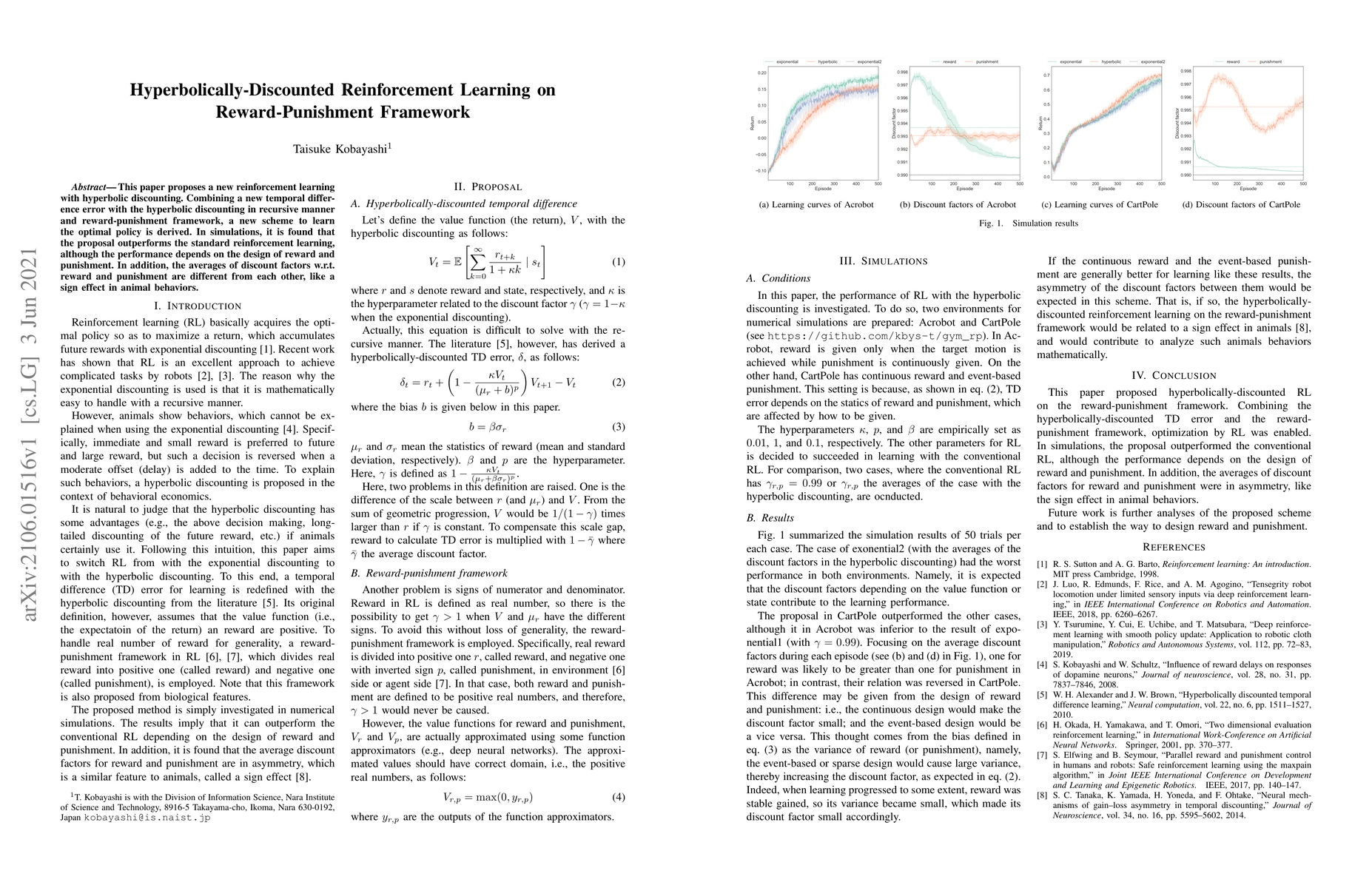 This paper proposes a hyperbolically-discounted reinforcement learning approach that integrates a new temporal difference error with a recursive hyperbolic discounting method within a reward-punishment framework. The proposed scheme outperforms standard reinforcement learning in simulations, with distinct average discount factors for rewards and punishments, mirroring a sign effect observed in animal behaviors.