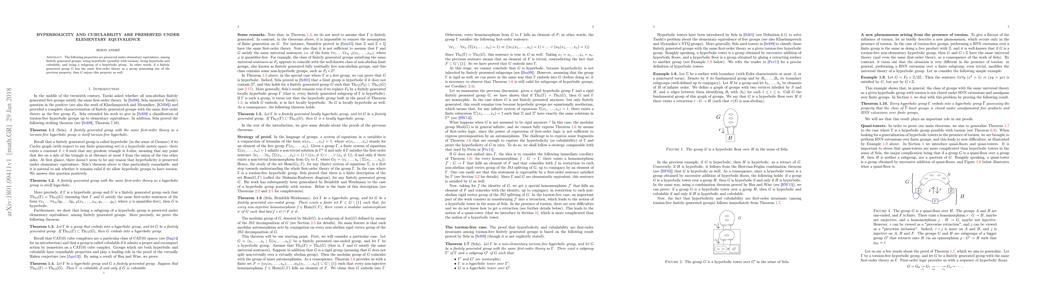 The following properties are preserved under elementary equivalence, among finitely generated groups: being hyperbolic (possibly with torsion), being hyperbolic and cubulable, and being a subgroup of a hyperbolic group. In other words, if a finitely generated group G has the same first-order theory as a group possessing one of the previous property, then G enjoys this property as well.