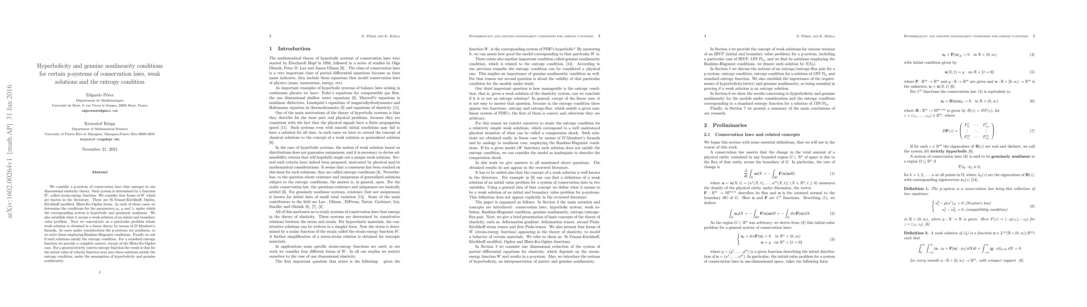 We consider a p-system of conservation laws that emerges in one dimensional elasticity theory. Such system is determined by a function $W$, called strain-energy function. We consider four forms of $W$ which are known in the literature. These are St.Venant-Kirchhoff, Ogden, Kirchhoff modified, Blatz-Ko-Ogden forms. In each of those cases we determine the conditions for the parameters $\rho_0$, $\mu $ and $\lambda$, under which the corresponding system is hyperbolic and genuinely nonlinear. We also establish what it means a weak solution of an initial and boundary value problem. Next we concentrate on a particular problem whose weak solution is obtained in a linear theory by means of D'Alembert's formula. In cases under consideration the p-systems are nonlinear, so we solve them employing Rankine-Hugoniot conditions. Finally we ask if such solutions satisfy the entropy condition. For a standard entropy function we provide a complete answer, except of the Blatz-Ko-Ogden case. For a general strictly convex entropy function the result is that for the initial value of velocity function near zero these solutions satisfy the entropy condition, under the assumption of hyperbolicity and genuine nonlinearity.