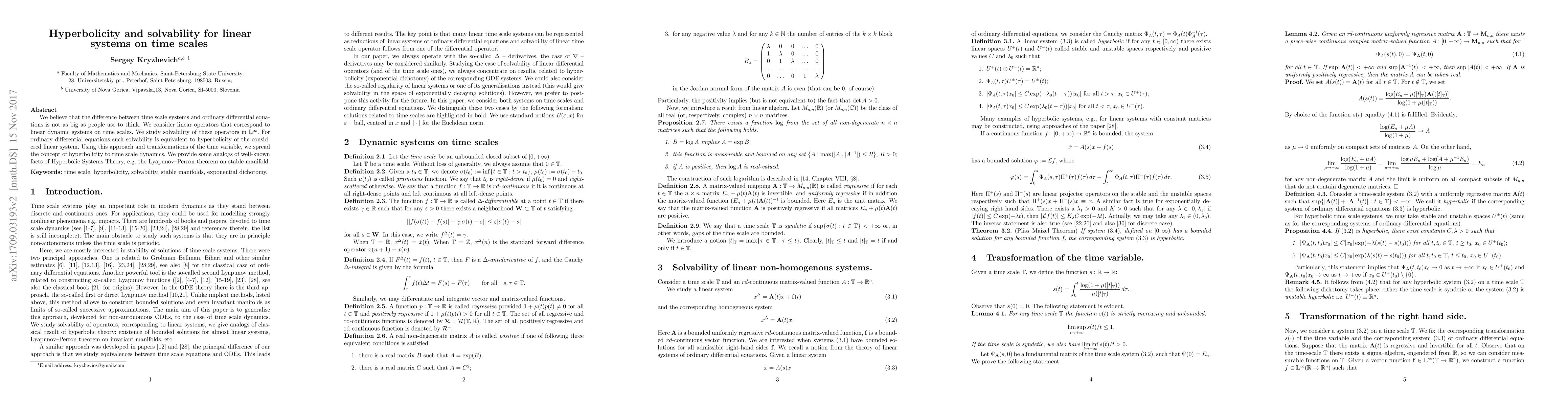 We believe that the difference between time scale systems and ordinary differential equations is not as big as people use to think. We consider linear operators that correspond to linear dynamic systems on time scales. We study solvability of these operators in ${\mathbb L}^\infty$. For ordinary differential equations such solvability is equivalent to hyperbolicity of the considered linear system. Using this approach and transformations of the time variable, we spread the concept of hyperbolicity to time scale dynamics. We provide some analogs of well-known facts of Hyperbolic Systems Theory, e.g. the Lyapunov--Perron theorem on stable manifold.