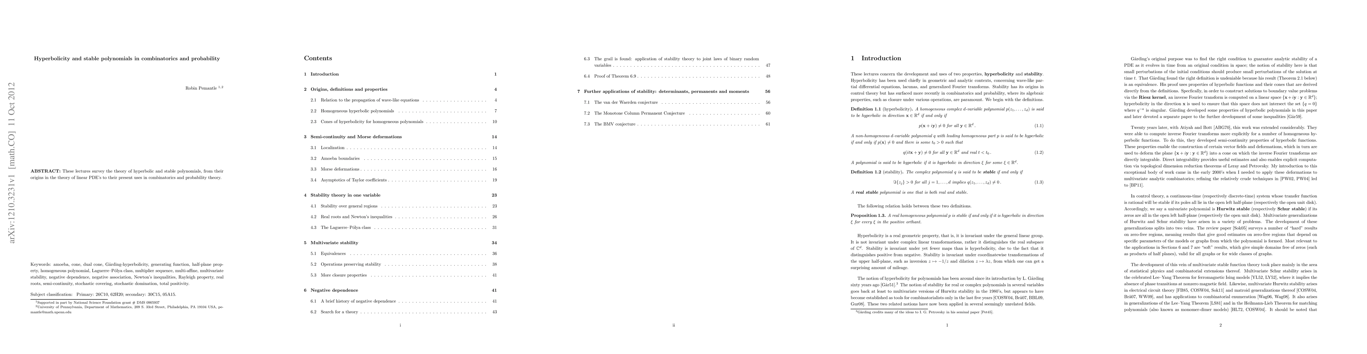 Summary: This paper surveys the theory of hyperbolic and stable polynomials, tracing their development from linear PDEs to contemporary applications in combinatorics and probability. The content is based on lectures presented at the 2011 Current Developments in Mathematics conference.