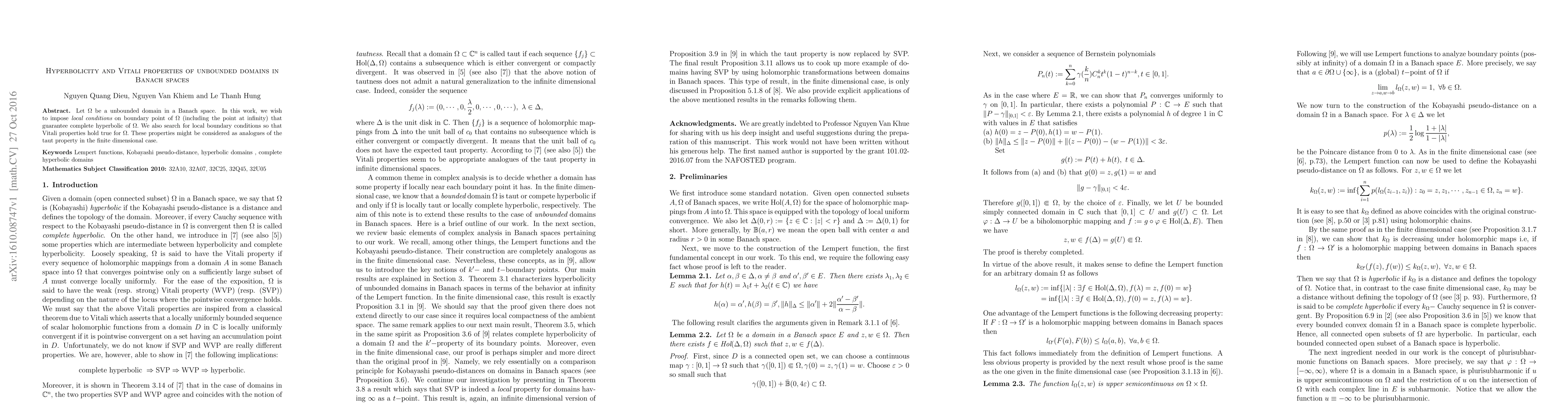 Let $\Om$ be a unbounded domain in a Banach space. In this work, we wish to impose {\it local conditions} on boundary point of $\Om$ (including the point at infinity) that guarantee complete hyperbolic of $\Om.$ We also search for local boundary conditions so that Vitali properties hold true for $\Om.$ These properties might be considered as analogues of the taut property in the finite dimensional case.