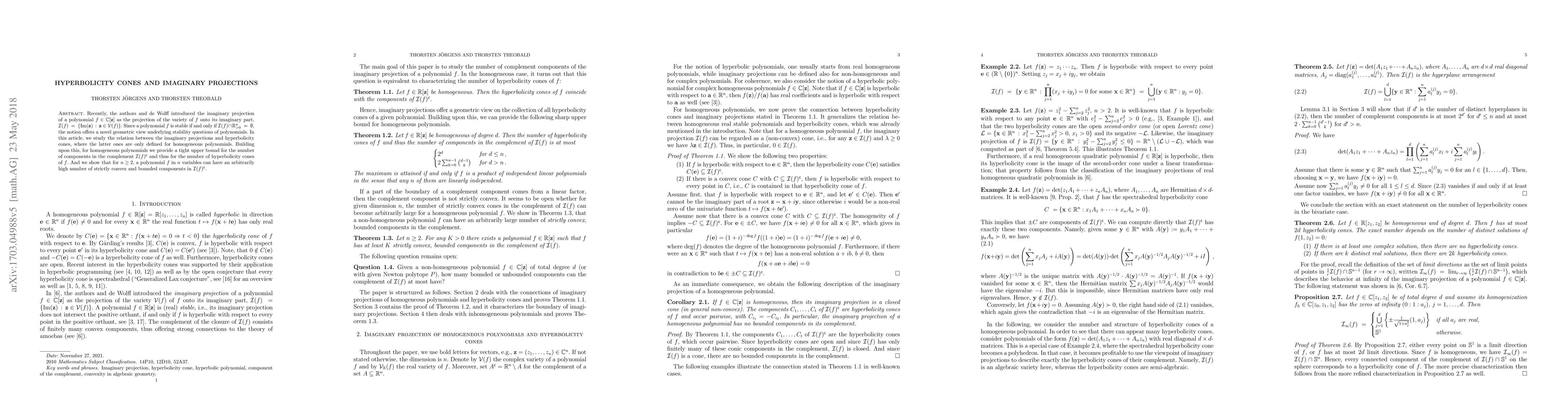 This paper explores the connection between imaginary projections of polynomials and hyperbolicity cones, providing a novel geometric perspective on polynomial stability. It establishes a tight upper bound for the number of components in the complement of the imaginary projection and demonstrates that high-dimensional polynomials can have numerous strictly convex and bounded components in this complement.
