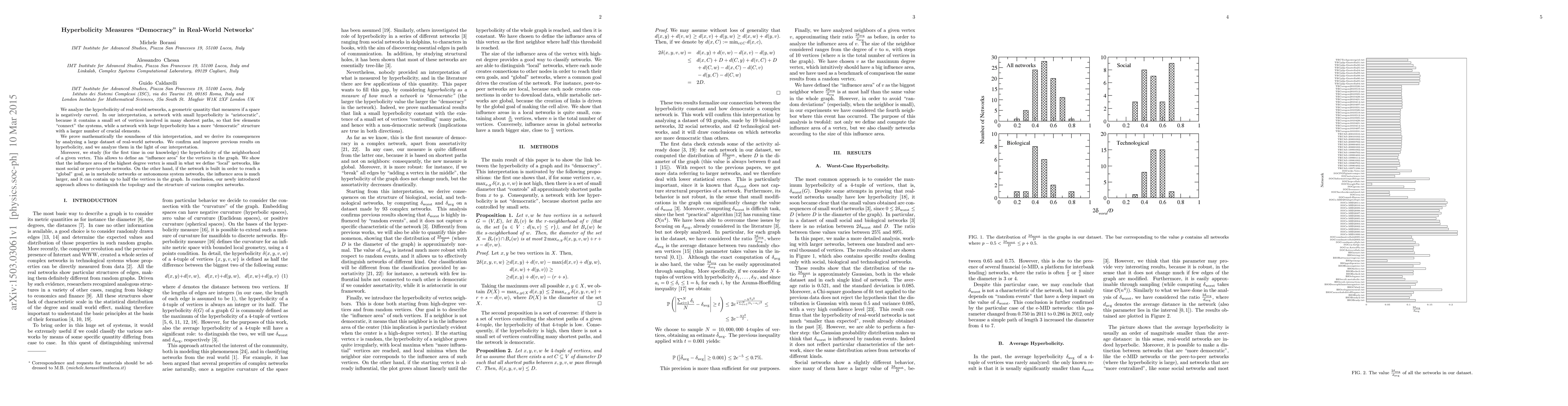 We analyze the hyperbolicity of real-world networks, a geometric quantity that measures if a space is negatively curved. In our interpretation, a network with small hyperbolicity is "aristocratic", because it contains a small set of vertices involved in many shortest paths, so that few elements "connect" the systems, while a network with large hyperbolicity has a more "democratic" structure with a larger number of crucial elements. We prove mathematically the soundness of this interpretation, and we derive its consequences by analyzing a large dataset of real-world networks. We confirm and improve previous results on hyperbolicity, and we analyze them in the light of our interpretation. Moreover, we study (for the first time in our knowledge) the hyperbolicity of the neighborhood of a given vertex. This allows to define an "influence area" for the vertices in the graph. We show that the influence area of the highest degree vertex is small in what we define "local" networks, like most social or peer-to-peer networks. On the other hand, if the network is built in order to reach a "global" goal, as in metabolic networks or autonomous system networks, the influence area is much larger, and it can contain up to half the vertices in the graph. In conclusion, our newly introduced approach allows to distinguish the topology and the structure of various complex networks.