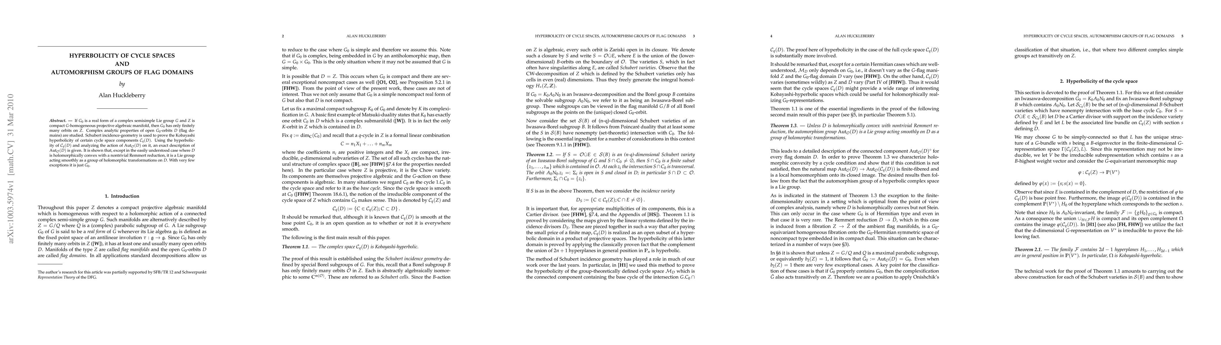 If G_0 is a real form of a complex semisimple Lie group G and Z is compact G-homogeneous projective algebraic manifold, then G_0 has only finitely many orbits on Z. Complex analytic properties of open G_0-orbits D (flag domains) are studied. Schubert incidence-geometry is used to prove the Kobayashi hyperbolicity of certain cycle space components C_q(D). Using the hyperbolicity of C_q(D) and analyzing the action of Aut(D) on it, an exact description of Aut(D) is given. It is shown that, except in the easily understood case where D is holomorphically convex with a nontrivial Remmert reduction, it is a Lie group acting smoothly as a group of holomorphic transformations on D. With very few exceptions it is just G_0.