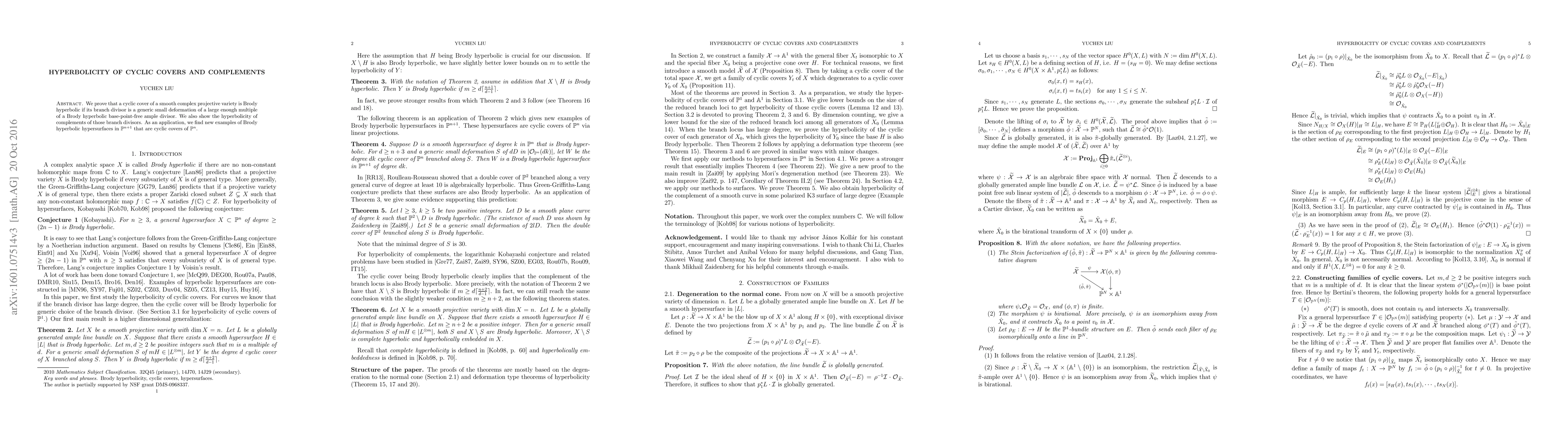 This paper proves the hyperbolicity of cyclic covers of smooth complex projective varieties under certain conditions on their branch divisors, and demonstrates the hyperbolicity of complements of these branch divisors. It also provides new examples of Brody hyperbolic hypersurfaces in projective spaces that are cyclic covers of $\mathbb{P}^n$.