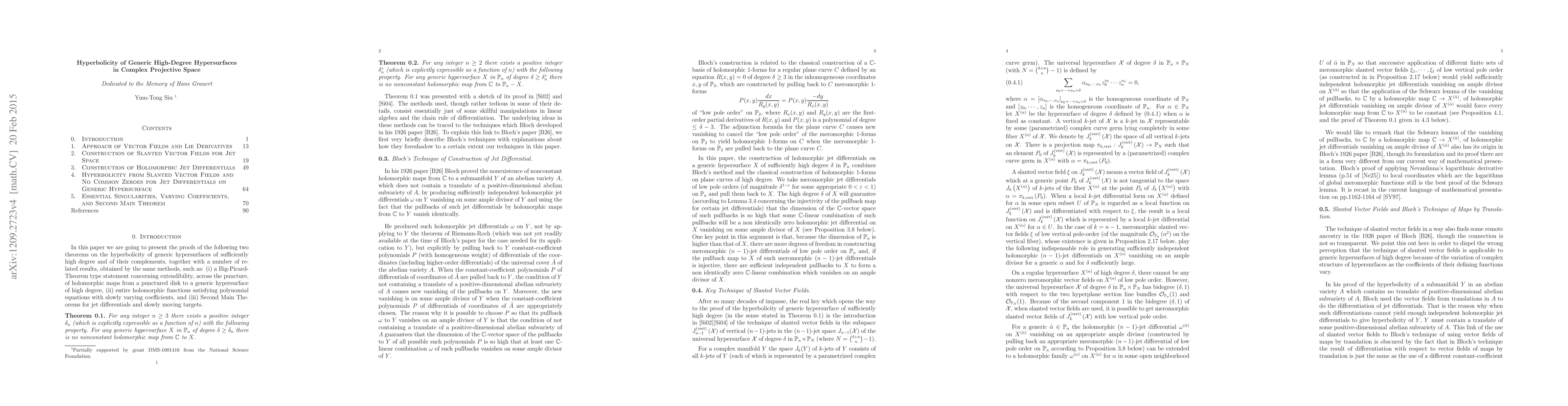 This paper proves the hyperbolicity of generic high-degree hypersurfaces in complex projective space using meromorphic jet differentials and slanted vector fields. It also presents related results including extendibility of holomorphic maps, nonexistence of entire function sets, and Second Main Theorems.