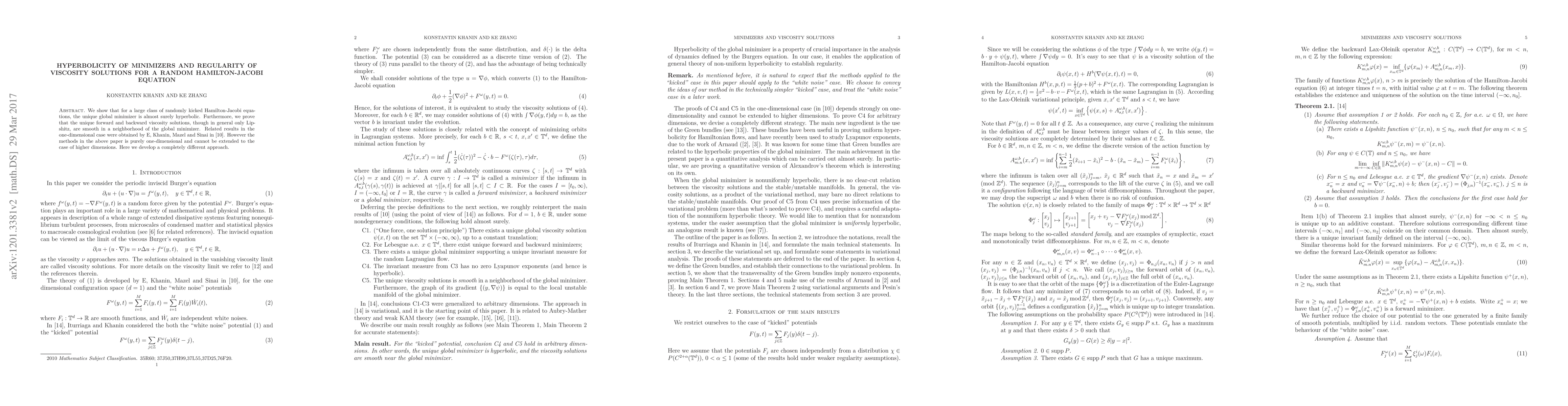 We show that for a family of randomly kicked Hamilton-Jacobi equations, the unique global minimizer is hyperbolic, almost surely. Furthermore, we prove the unique forward and backward viscosity solutions, though in general only Lipshitz, are smooth in a neighbourhood of the global minimizer. Our result generalizes the result of E, Khanin, Mazel and Sinai (\cite{EKMS00}) to dimension $d\ge 2$, and extends the result of Iturriaga and Khanin in \cite{IK03}.