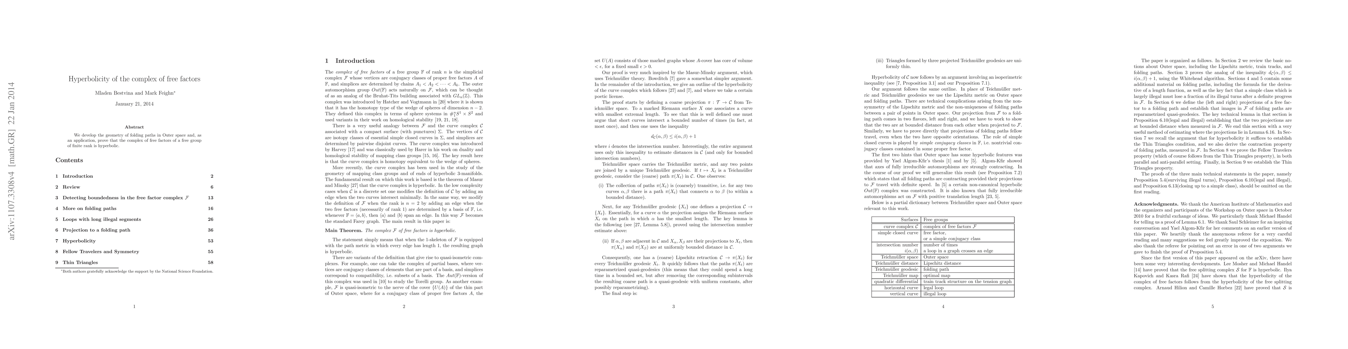 This research proves that the complex structure formed by free factors of a free group of finite rank exhibits hyperbolic geometry, utilizing the development of folding paths' geometry in Outer space. This implies significant insights into the free group's algebraic and geometric properties.
