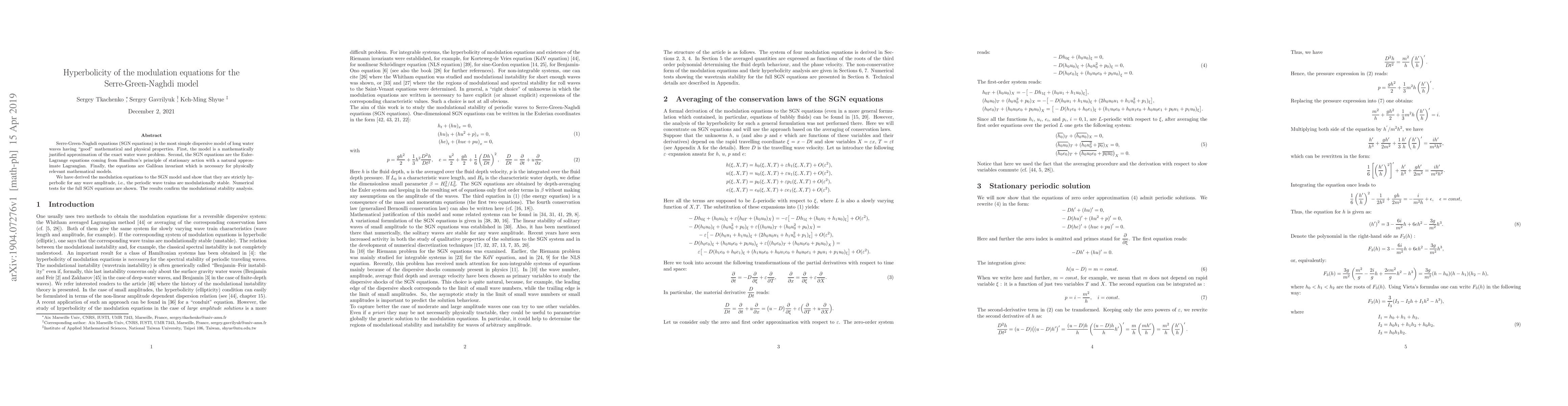 This paper investigates the hyperbolicity of modulation equations derived from the Serre-Green-Naghdi (SGN) model for long water waves, demonstrating their strict hyperbolicity for any wave amplitude. Numerical tests confirm the modulational stability of periodic wave trains predicted by the analysis.
