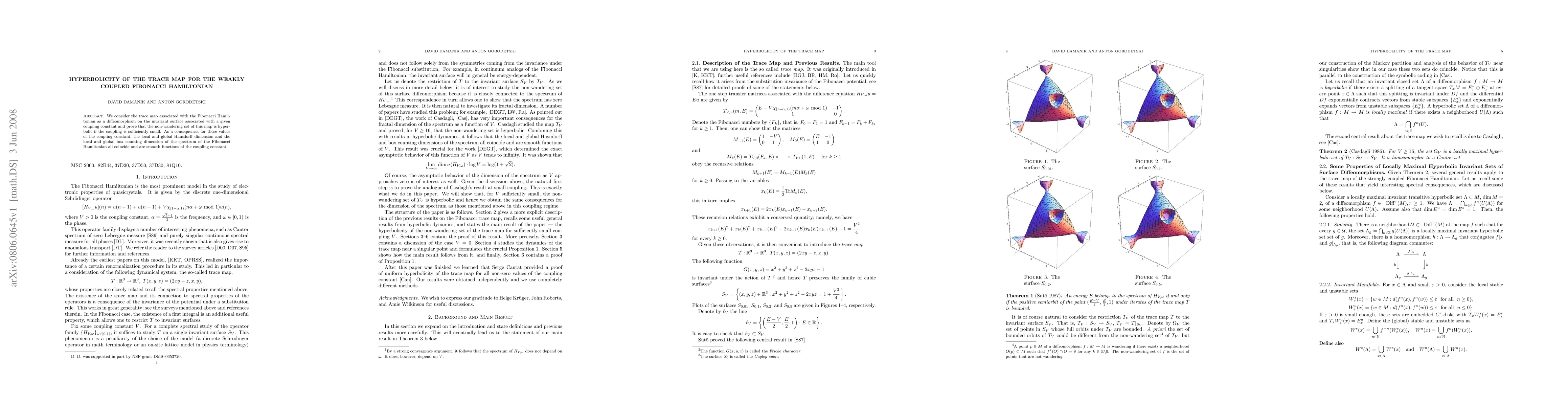 We consider the trace map associated with the Fibonacci Hamiltonian as a diffeomorphism on the invariant surface associated with a given coupling constant and prove that the non-wandering set of this map is hyperbolic if the coupling is sufficiently small. As a consequence, for these values of the coupling constant, the local and global Hausdorff dimension and the local and global box counting dimension of the spectrum of the Fibonacci Hamiltonian all coincide and are smooth functions of the coupling constant.
