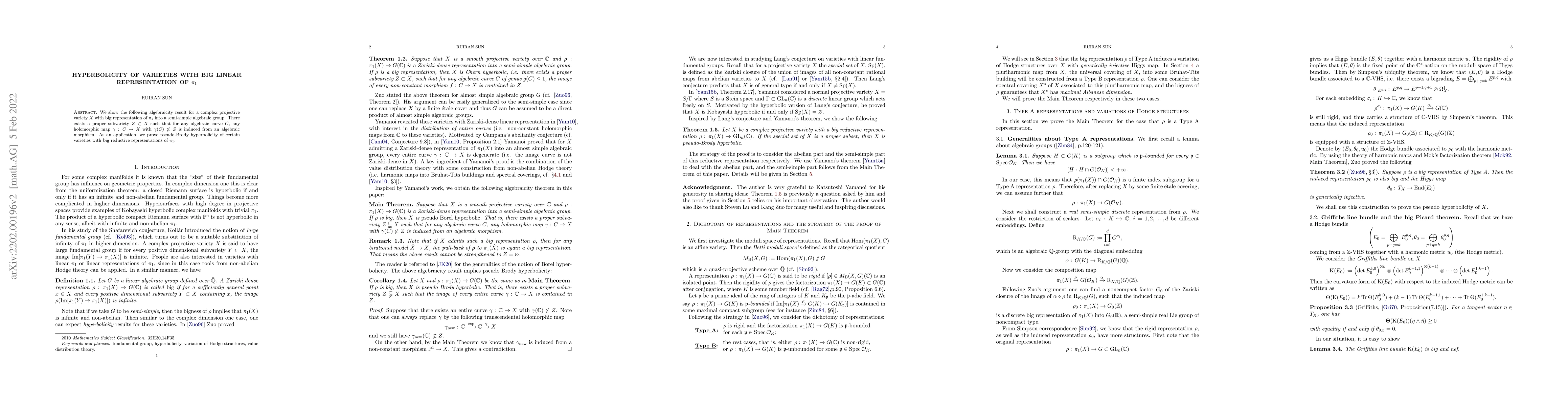 This paper demonstrates that complex projective varieties with a large representation of their fundamental group into a semi-simple algebraic group contain a proper subvariety $Z$, such that any holomorphic map from an algebraic curve into $X$ not contained in $Z$ is induced by an algebraic morphism. It also proves the pseudo-Brody hyperbolicity of certain varieties with significant reductive representations of $\pi_1$.