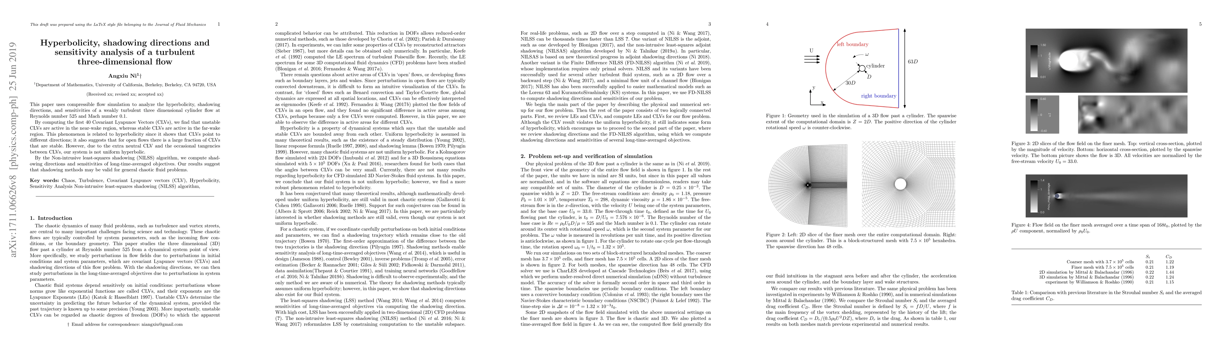 This paper uses compressible flow simulation to analyze the hyperbolicity, shadowing directions, and sensitivities of a weakly turbulent three dimensional cylinder flow at Reynolds number 525 and Mach number 0.1. By computing the first 40 Covariant Lyapunov Vectors (CLVs), we find that unstable CLVs are active in the near-wake region, whereas stable CLVs are active in the far-wake region. This phenomenon is related to hyperbolicity since it shows that CLVs point to different directions; it also suggests that for open flows there is a large fraction of CLVs that are stable. However, due to the extra neutral CLV and the occasional tangencies between CLVs, our system is not uniform hyperbolic. By the Non-intrusive least-squares shadowing (NILSS) algorithm, we compute shadowing directions and sensitivities of long-time-averaged objectives. Our results suggest that shadowing methods may be valid for general chaotic fluid problems.