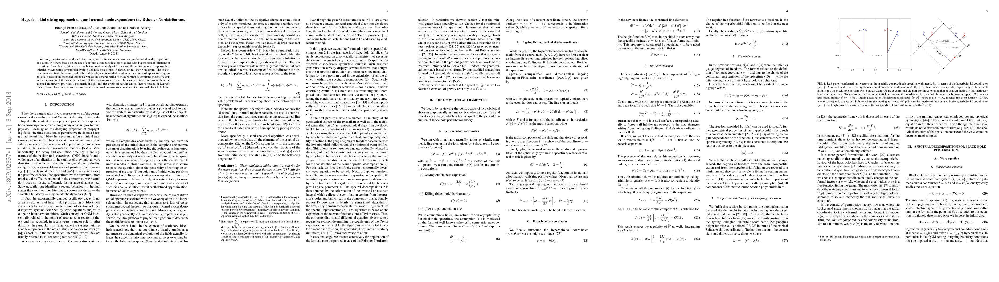 We study quasi-normal modes of black holes, with a focus on resonant (or quasi-normal mode) expansions, in a geometric frame based on the use of conformal compactifications together with hyperboloidal foliations of spacetime. Specifically, this work extends the previous study of Schwarzschild in this geometric approach to spherically symmetric asymptotically flat black hole spacetimes, in particular Reissner-Nordstr\"om. The discussion involves, first, the non-trivial technical developments needed to address the choice of appropriate hyperboloidal slices in the extended setting as well as the generalization of the algorithm determining the coefficients in the expansion of the solution in terms of the quasi-normal modes. In a second stage, we discuss how the adopted framework provides a geometric insight into the origin of regularization factors needed in Leaver's Cauchy based foliations, as well as into the discussion of quasi-normal modes in the extremal black hole limit.