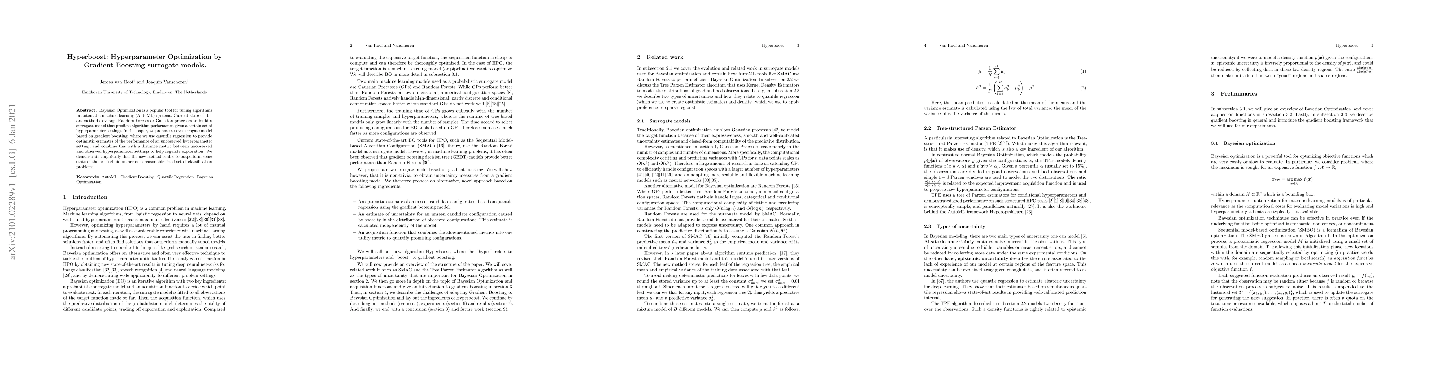 This paper proposes a new gradient boosting surrogate model for hyperparameter optimization in AutoML, using quantile regression for optimistic performance estimates and a distance metric for exploration regulation. Empirical results show that the method outperforms some state-of-the-art techniques on classification problems.