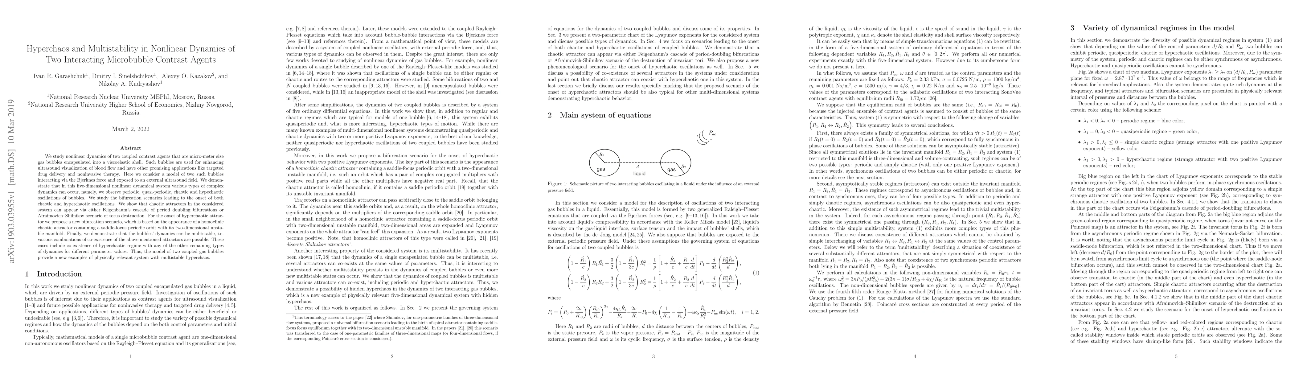 This paper investigates the nonlinear dynamics of two interacting microbubble contrast agents, revealing complex behaviors including periodic, quasi-periodic, chaotic, and hyperchaotic oscillations. The study proposes new bifurcation scenarios for hyperchaotic dynamics and demonstrates multistability among these dynamic regimes.