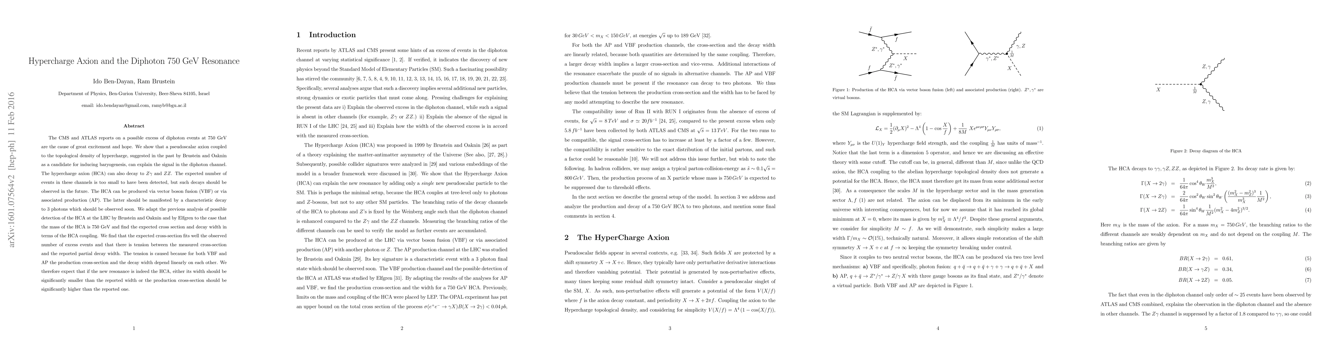 The CMS and ATLAS reports on a possible excess of diphoton events at $750$ GeV are the cause of great excitement and hope. We show that a pseudoscalar axion coupled to the topological density of hypercharge, suggested in the past by Brustein and Oaknin as a candidate for inducing baryogenesis, can explain the signal in the diphoton channel. The hypercharge axion (HCA) can also decay to $Z\gamma$ and $ZZ$. The expected number of events in these channels is too small to have been detected, but such decays should be observed in the future. The HCA can be produced via vector boson fusion (VBF) or via associated production (AP). The latter should be manifested by a characteristic decay to 3 photons which should be observed soon. We adapt the previous analysis of possible detection of the HCA at the LHC by Brustein and Oaknin and by Elfgren to the case that the mass of the HCA is 750 GeV and find the expected cross section and decay width in terms of the HCA coupling. We find that the expected cross-section fits well the observed number of excess events and that there is tension between the measured cross-section and the reported partial decay width. The tension is caused because for both VBF and AP the production cross-section and the decay width depend linearly on each other. We therefore expect that if the new resonance is indeed the HCA, either its width should be significantly smaller than the reported width or the production cross-section should be significantly higher than the reported one.