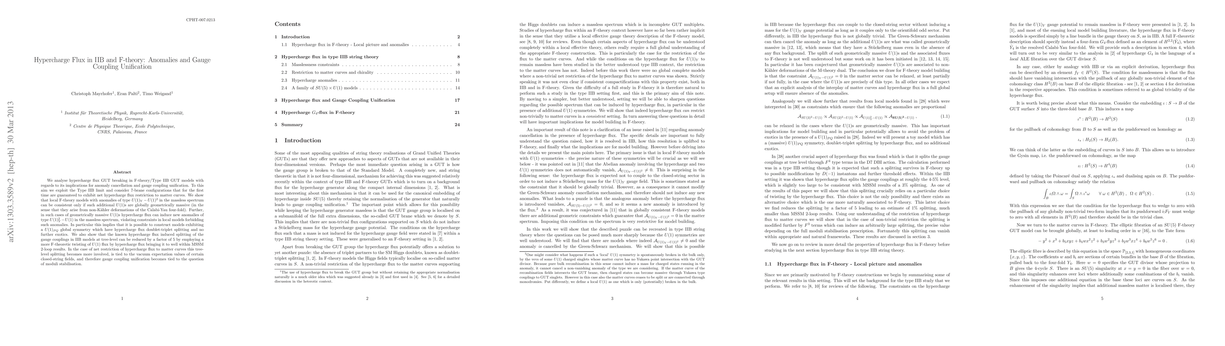 This paper investigates hypercharge flux in F-theory/Type IIB models, focusing on its implications for anomaly cancellation and gauge coupling unification. It demonstrates that certain U(1) gauge symmetries must be geometrically massive to resolve U(1)_Y-U(1)^2 anomalies, and shows that hypercharge flux can induce new anomalies, necessitating a U(1)_{PQ} global symmetry. Additionally, it proposes a method to significantly reduce gauge coupling splitting, linking unification to moduli stabilization.
