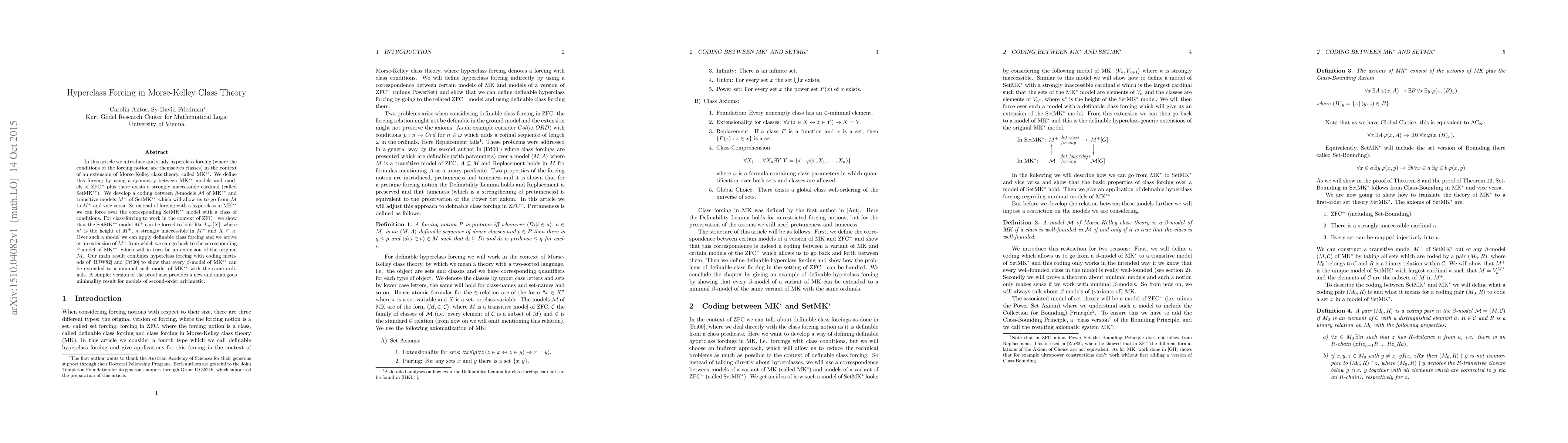 In this article we introduce and study hyperclass-forcing (where the conditions of the forcing notion are themselves classes) in the context of an extension of Morse-Kelley class theory, called MK$^{**}$. We define this forcing by using a symmetry between MK$^{**}$ models and models of ZFC$^-$ plus there exists a strongly inaccessible cardinal (called SetMK$^{**}$). We develop a coding between $\beta$-models $\mathcal{M}$ of MK$^{**}$ and transitive models $M^+$ of SetMK$^{**}$ which will allow us to go from $\mathcal{M}$ to $M^+$ and vice versa. So instead of forcing with a hyperclass in MK$^{**}$ we can force over the corresponding SetMK$^{**}$ model with a class of conditions. For class-forcing to work in the context of ZFC$^-$ we show that the SetMK$^{**}$ model $M^+$ can be forced to look like $L_{\kappa^*}[X]$, where $\kappa^*$ is the height of $M^+$, $\kappa$ strongly inaccessible in $M^+$ and $X\subseteq\kappa$. Over such a model we can apply definable class forcing and we arrive at an extension of $M^+$ from which we can go back to the corresponding $\beta$-model of MK$^{**}$, which will in turn be an extension of the original $\mathcal{M}$. Our main result combines hyperclass forcing with coding methods of [BJW82] and [Fri00] to show that every $\beta$-model of MK$^{**}$ can be extended to a minimal such model of MK$^{**}$ with the same ordinals. A simpler version of the proof also provides a new and analogous minimality result for models of second-order arithmetic.
