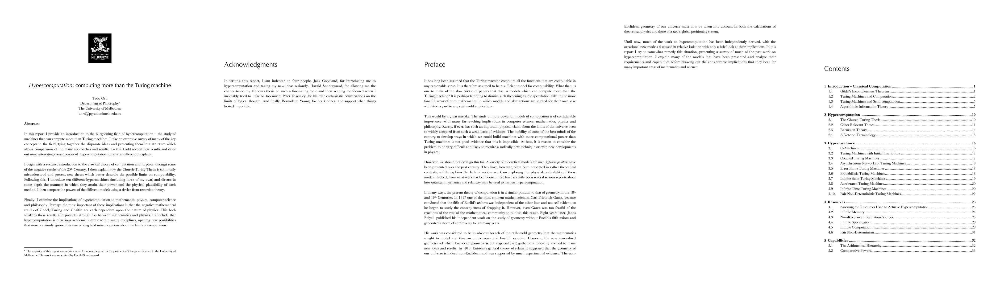 Due to common misconceptions about the Church-Turing thesis, it has been widely assumed that the Turing machine provides an upper bound on what is computable. This is not so. The new field of hypercomputation studies models of computation that can compute more than the Turing machine and addresses their implications. In this report, I survey much of the work that has been done on hypercomputation, explaining how such non-classical models fit into the classical theory of computation and comparing their relative powers. I also examine the physical requirements for such machines to be constructible and the kinds of hypercomputation that may be possible within the universe. Finally, I show how the possibility of hypercomputation weakens the impact of Godel's Incompleteness Theorem and Chaitin's discovery of 'randomness' within arithmetic.