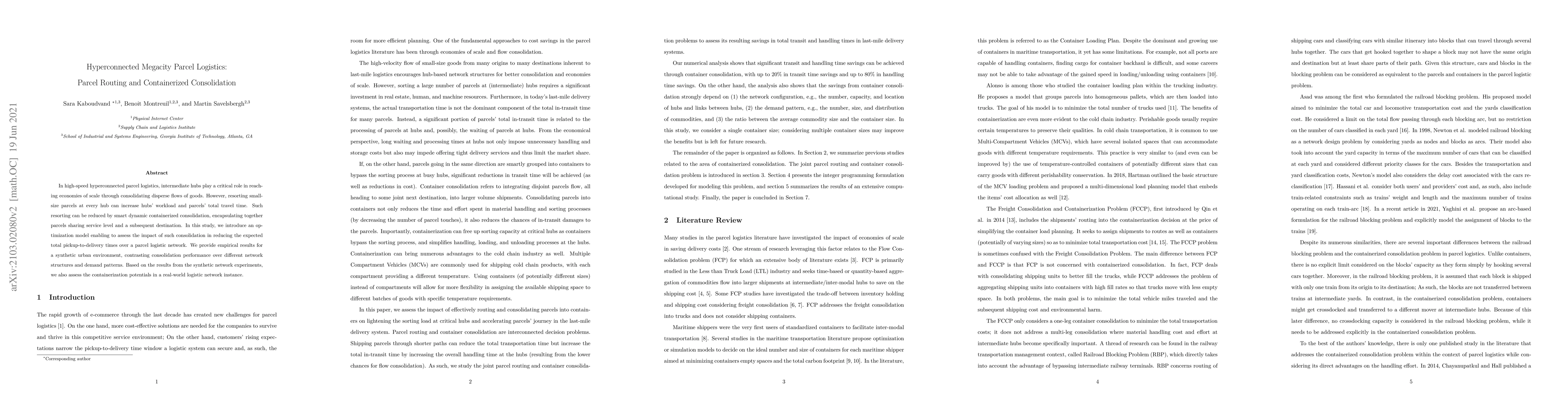 This study proposes an optimization model for parcel logistics in hyperconnected megacities, focusing on containerized consolidation to reduce resort times and improve sustainability. Empirical results show the impact of consolidation on reducing total travel times and enhancing urban logistics efficiency across various operational scenarios.