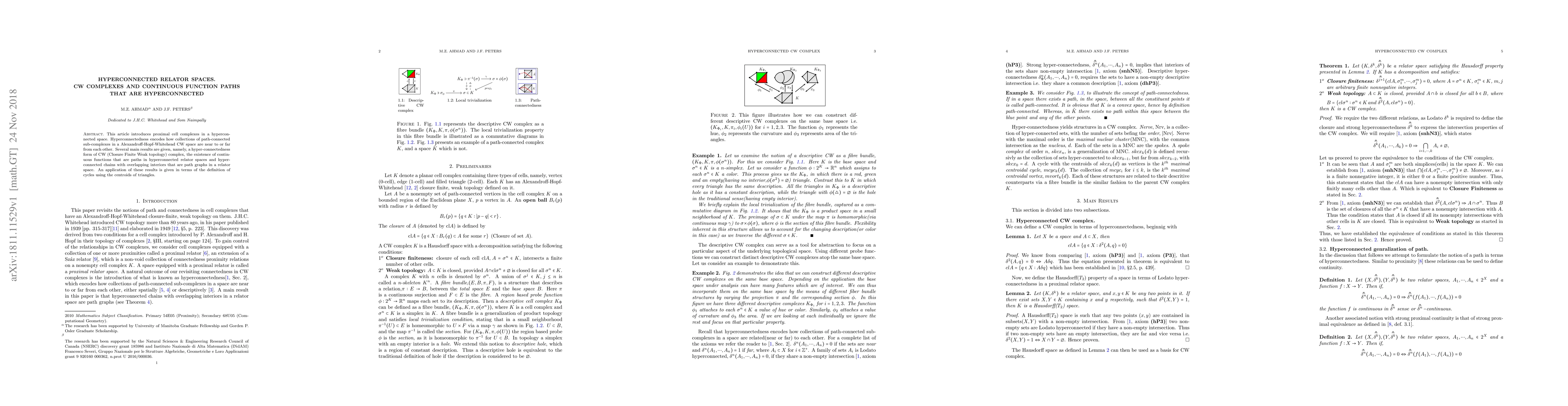 This article introduces proximal cell complexes in a hyperconnected space. Hyperconnectedness encodes how collections of path-connected sub-complexes in a Alexandroff-Hopf-Whitehead CW space are near to or far from each other. Several main results are given, namely, a hyper-connectedness form of CW (Closure Finite Weak topology) complex, the existence of continuous functions that are paths in hyperconnected relator spaces and hyperconnected chains with overlapping interiors that are path graphs in a relator space. An application of these results is given in terms of the definition of cycles using the centroids of triangles.