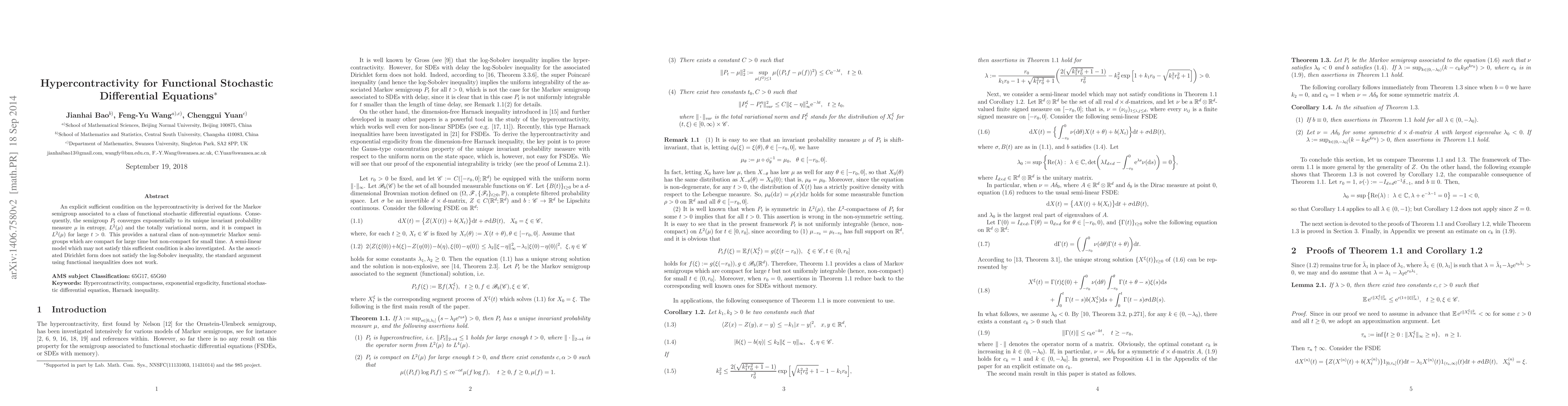 This paper derives a sufficient condition for hypercontractivity in Markov semigroups linked to functional stochastic differential equations, demonstrating exponential convergence to a unique invariant measure in various norms. It also explores a semi-linear model that may not meet this condition.