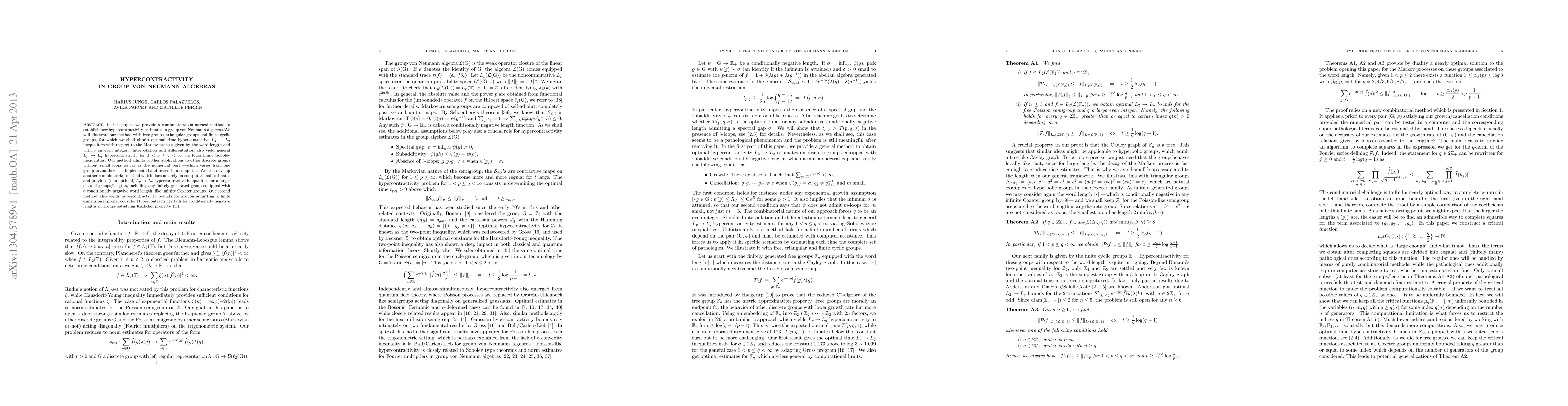 In this paper, we provide a combinatorial/numerical method to establish new hypercontractivity estimates in group von Neumann algebras. We will illustrate our method with free groups, triangular groups and finite cyclic groups, for which we shall obtain optimal time hypercontractive $L_2 \to L_q$ inequalities with respect to the Markov process given by the word length and with $q$ an even integer. Interpolation and differentiation also yield general $L_p \to L_q$ hypercontrativity for $1 < p \le q < \infty$ via logarithmic Sobolev inequalities. Our method admits further applications to other discrete groups without small loops as far as the numerical part ---which varies from one group to another--- is implemented and tested in a computer. We also develop another combinatorial method which does not rely on computational estimates and provides (non-optimal) $L_p \to L_q$ hypercontractive inequalities for a larger class of groups/lengths, including any finitely generated group equipped with a conditionally negative word length, like infinite Coxeter groups. Our second method also yields hypercontractivity bounds for groups admitting a finite dimensional proper cocycle. Hypercontractivity fails for conditionally negative lengths in groups satisfying Kazhdan property (T).