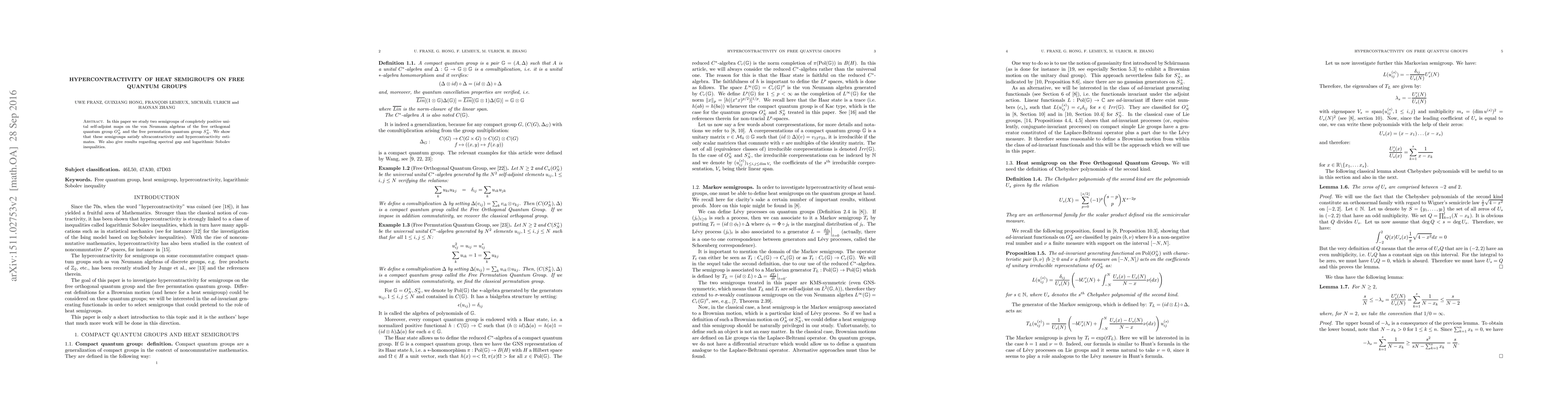 This paper investigates two semigroups on free quantum groups, demonstrating their ultracontractivity and hypercontractivity, and provides insights into spectral gaps and logarithmic Sobolev inequalities. The focus is on the von Neumann algebras of the free orthogonal and permutation quantum groups.